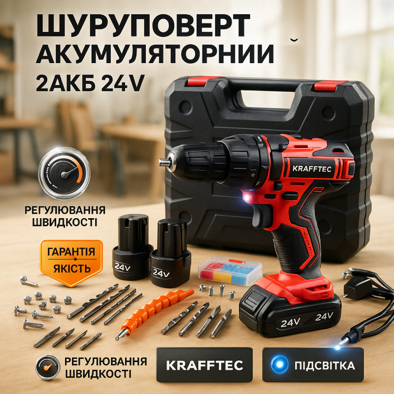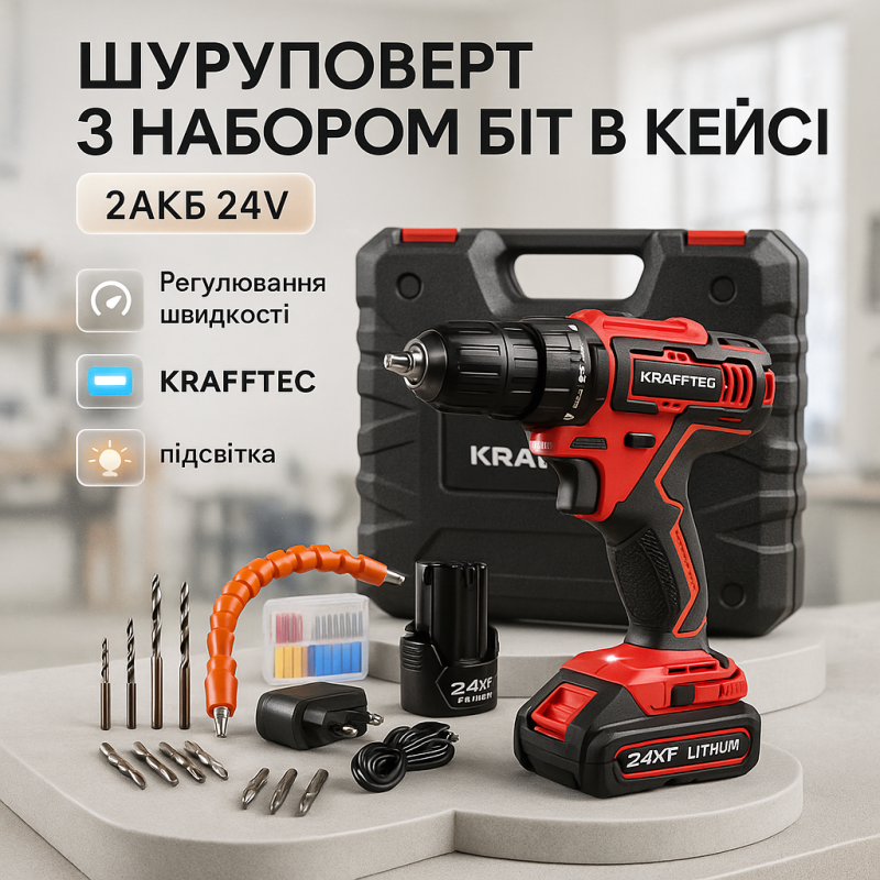 Идеальный инструмент для домашнего мастерства и профессиональных задач – аккумуляторный шуруповерт KRAFFTEC мощностью 24 В с набором насадок. Этот надежный инструмент обеспечит вам максимальную производительность и удобство работы с разными поверхностями и материалами.