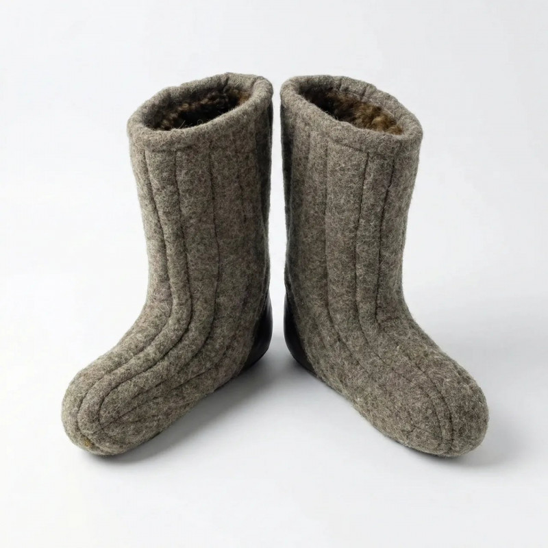 Классические войлочные бурки — самая теплая и удобная обувь для суровой зимы. Эта модель идеально подходит как для носки в прохладных помещениях (частный дом, дача), так и для улицы в сухую морозную погоду. Верх изготовлен из плотного войлочного материала (сукно), который отлично сохраняет тепло, позволяя ногам "дышать". Внутри обувь утеплена густым искусственным мехом, что обеспечивает комфорт даже при низких температурах. Особенностью модели является усиленная вставка из кожзама на пятке, которая защищает обувь от истирания и продлевает срок её службы, а также предотвращает промокание задника. Подошва мягкая, прошитая, не скользит. Характеристики: Тип обуви: Бурки / Валенки / Бабуши Материал верха: Войлок (сукно) Материал подкладки: Искусственный мех Цвет: Серый натуральный Особенности: Усиленная пятка (накладка), прошитая подошва Сезон: Зима