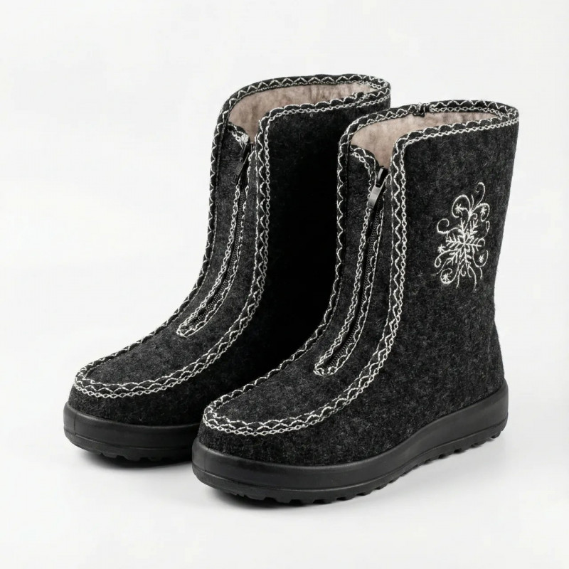 Уютные и теплые женские бурки (чуни) с декоративной вышивкой «Снежинка» — это идеальное сочетание комфорта и приятного внешнего вида. Эта модель станет незаменимой для дома в холодное время года, а также подойдет для выхода во двор в сухую погоду. Верх изготовлен из плотного темно-серого войлока, который отлично аккумулирует тепло. Главная особенность модели — белая вышивка в виде снежинки на голенище, что добавляет обуви зимнего настроения и делает её прекрасным вариантом для подарка. Внутри бурки утеплены густым искусственным мехом, который окутывает ногу теплом. Удобная застежка-молния спереди позволяет быстро и легко обуваться, не наклоняясь слишком низко, что особенно важно для людей почтенного возраста. Подошва литая, надежная и не скользит на гладких поверхностях. Характеристики: Сезон: Зима / Холодная осень Материал верха: Войлок (текстиль) Материал подкладки: Искусственный мех (очень теплый) Декор: Вышивка «Снежинка», декоративный шов Застежка: Молния спереди Подошва: ПВХ (износостойкая) Страна производитель: Украина Размеры в наличии: 37, 38, 39, 40, 41