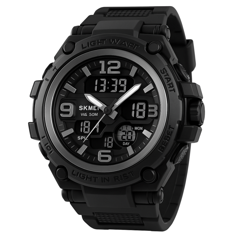 Часы SKMEI 1452BK BLACK сочетают агрессивный спортивный стиль с практичностью для повседневного использования. Благодаря массивному корпусу с четкими линиями и темному дизайну модель выглядит мощно и современно. Аналого-цифровой дисплей позволяет одновременно видеть как стрелочное, так и цифровое время, что удобно для активного ритма жизни.