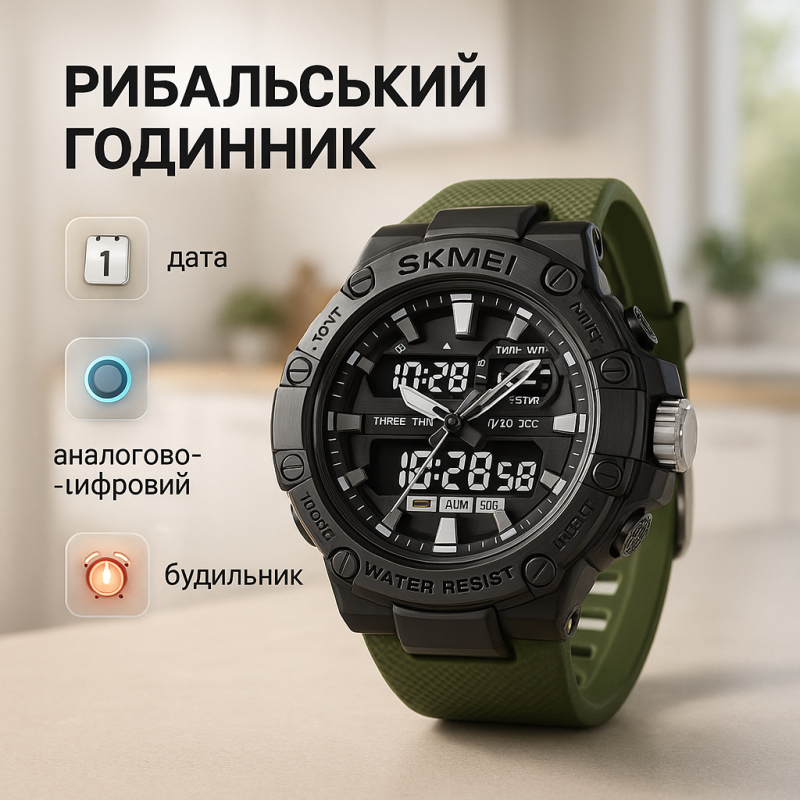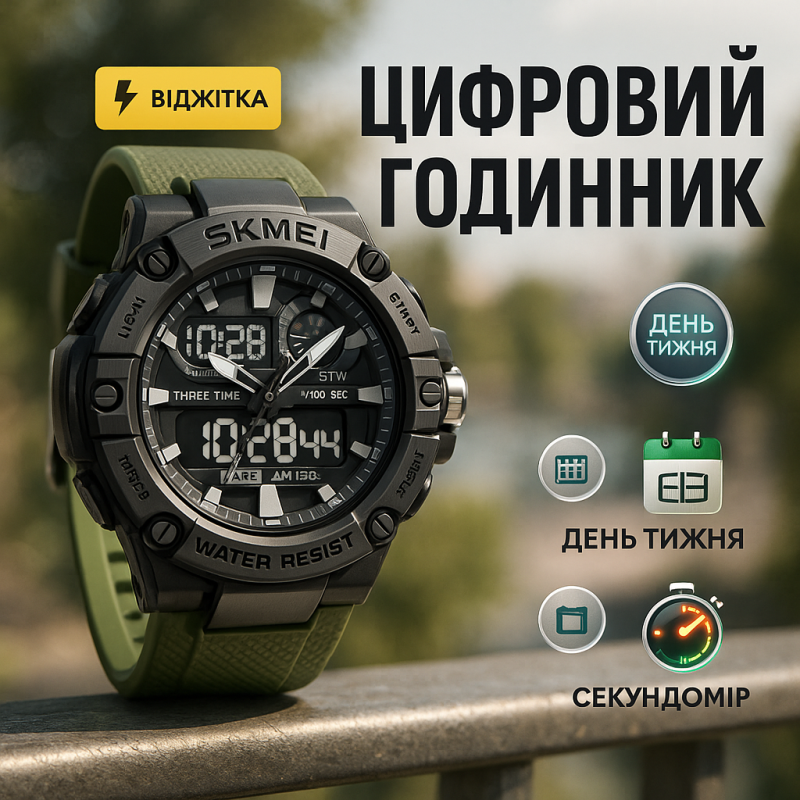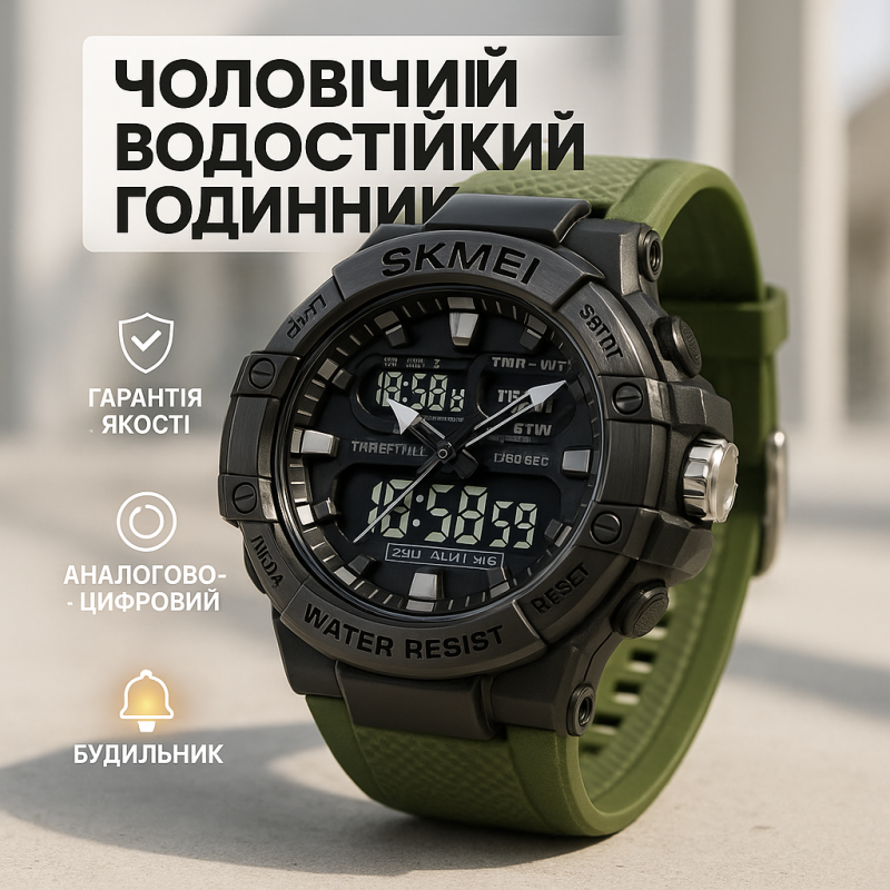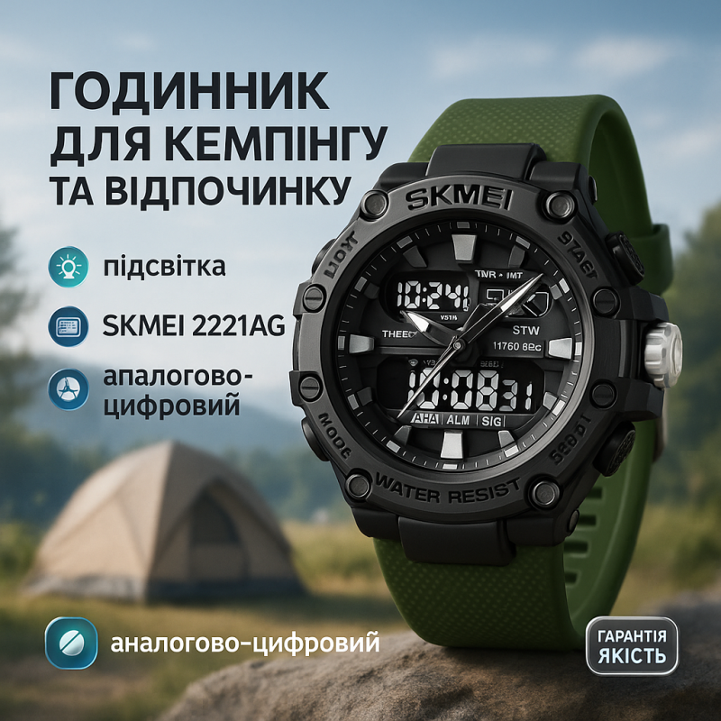 Часы SKMEI 2221AG — это современный аксессуар для активного образа жизни, сочетающий аналоговую классику с функциональностью цифрового дисплея. Его агрессивный дизайн с мощным корпусом, черным циферблатом и зеленым ремешком делают эти часы идеальными для мужчин, которые ценят стиль и надежность в любых условиях.