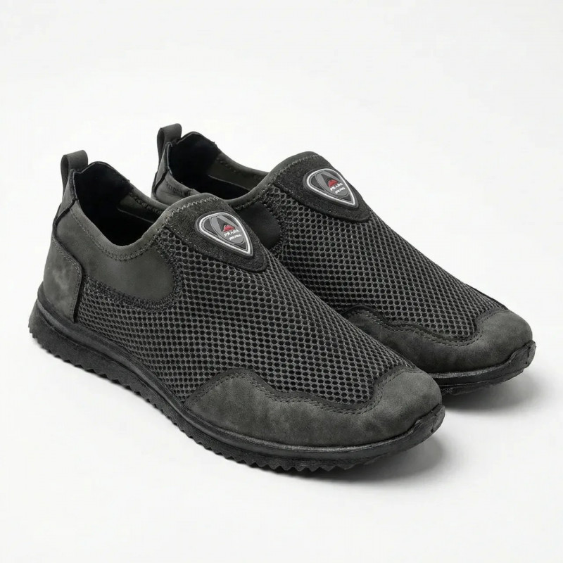 Практичность и комфорт в одной паре! Эти мужские слипоны — идеальный вариант для летнего сезона. Модель выполнена в популярном темно-сером цвете, который не маркий и отлично сочетается с джинсами, светлыми брюками или шортами. Главная особенность этой модели — комбинированный материал верха. Основная часть сделана из крупной текстильной сетки для максимальной вентиляции стопы. А носок и пятка усилены вставками из качественного эко-нубука. Это не только придает обуви стильный вид, но и защищает самые уязвимые места от износа и повреждений. Вместо шнурков здесь используются эластичные резинки, что позволяет быстро обуваться и обеспечивает удобную посадку на любой подъем. Подошва легкая, гибкая и имеет рельефный протектор для уверенной ходьбы. Характеристики: Материал верха: Текстильная сетка + Эко-нубук (усиленный носок/пятка) Материал подошвы: ПВХ (износостойкая, эластичная) Сезон: Лето / Теплая весна-осень Пол: Мужские Цвет: Темно-серый (графит) Размеры: 41-45 Страна производитель: Украина