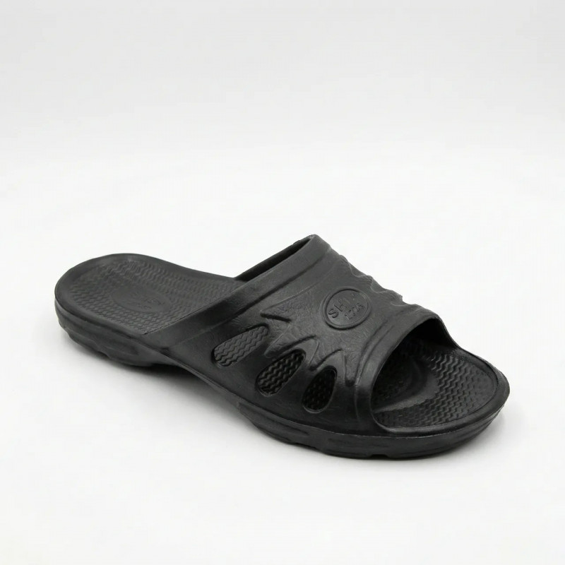 Эти классические черные шлепанцы — универсальное решение для любой ситуации. Они изготовлены из легкого и прочного материала EVA (пенка), что делает их практически невесомыми на ноге. Модель имеет сдержанный дизайн: широкий ремешок с перфорацией (отверстиями) обеспечивает отличную вентиляцию, поэтому нога не потеет даже в жару. Анатомическая стелька с рельефным узором создает легкий массажный эффект и предотвращает скольжение стопы. Они не боятся воды, грязи и солнца. Легко моются и мгновенно сохнут. Идеальный вариант для бассейна, сауны, огорода или пляжа. Характеристики: Тип: Шлепанцы / Сланцы. Сезон: Лето / Всесезонные. Цвет: Черный (Black). Материал: EVA (пенка). Размерный ряд: 40, 41, 42, 43, 44, 45, 46.