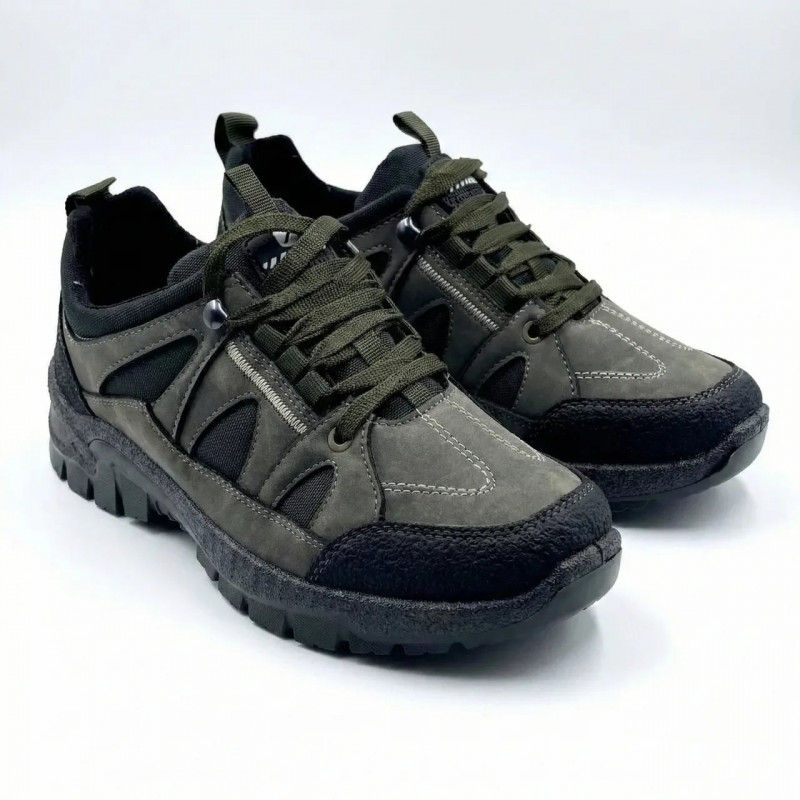 Надежные и прочные мужские кроссовки в стиле милитари, разработанные для эксплуатации в сложных условиях. Верх обуви выполнен из комбинации качественного эко-нубука и плотных текстильных вставок, что обеспечивает баланс между защитой от влаги и вентиляцией стопы. Цвет хаки (олива) делает эту модель практичной и незаметной в полевых условиях. Главное преимущество модели — специальное усиленное покрытие на носке и пятке ("антивандальное"), которое защищает пальцы от ударов, а обувь — от царапин и преждевременного износа. Массивная подошва с глубоким агрессивным протектором гарантирует отличное сцепление с любой поверхностью, будь то мокрая трава, грязь или камни. Удобная система шнуровки с металлическими крючками в верхней части позволяет надежно зафиксировать голеностоп, предотвращая травмы. Мягкая внутренняя подкладка обеспечивает комфорт даже при длительных пеших переходах. Характеристики: Тип обуви: Тактические кроссовки / Треккинговые туфли Материал верха: Эко-нубук + Текстиль Материал подошвы: ПВХ (тракторная, противоскользящая) Цвет: Хаки (Темно-зеленый / Олива) Сезон: Весна / Осень (Демисезон) Особенности: Усиленный прорезиненный носок и пятка Размеры: 41-45