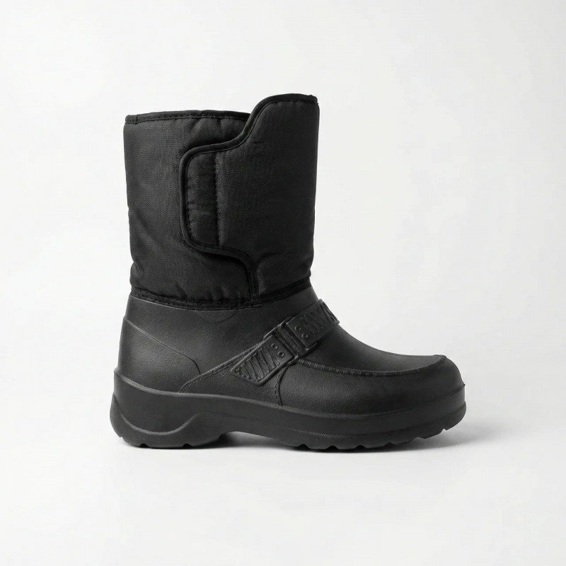 Особенностью этих сапог является широкая липучка, которая позволяет легко регулировать объем голенища и обеспечивает надежную фиксацию на ноге. Это особенно удобно для тех, кто носит теплые носки или имеет нестандартную полноту голени. Утепленная внутренняя часть создает комфортный микроклимат, сохраняя тепло даже при температуре до -30°C. Водонепроницаемые свойства материала ЭВА гарантируют, что ваши ноги останутся сухими в любую погоду — будь то снег, слякоть или дождь. Универсальный черный цвет легко сочетается с любой зимней одеждой, делая эти сапоги практичным выбором для повседневной носки, работы на улице или активного отдыха.
