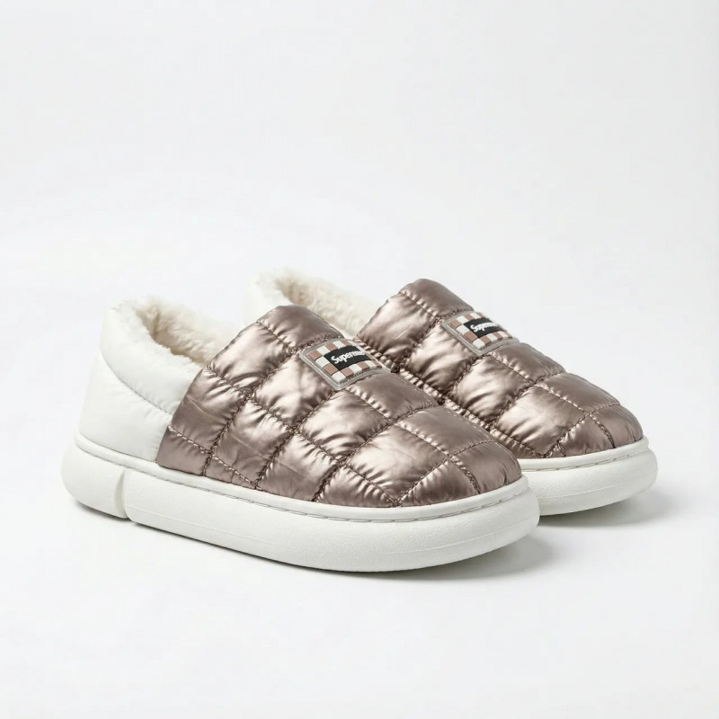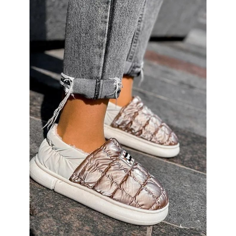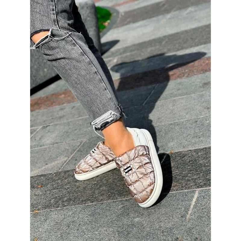 Стильные, легкие и невероятно удобные короткие дутики-угги цвета "кофе с молоком". Эта модель — настоящий хит сезона, сочетающий комфорт домашних тапочек и практичность уличной обуви. Благодаря широкому размерному ряду (от 36 до 45) модель отлично подойдет как женщинам, так и подросткам или даже мужчинам в качестве аккуратной сменной обуви. Верх выполнен из качественной стеганой плащевки с эффектом металлик (бронза), которая не боится влаги и легко чистится. Внутри — мягкий и густой эко-мех, обеспечивающий тепло и уют. Благодаря низкой посадке и эластичному заднику обувь обувается за секунду без лишних застежек (формат слипонов). Утолщенная подошва надежно изолирует стопу от холодной земли. Это идеальный вариант для тех, кто много времени проводит за рулем, или ищет максимально мягкую обувь для прогулок. Характеристики: Сезон: Зима / Поздняя осень Материал верха: Водоотталкивающая плащевка (нейлон) Материал подкладки: Густой искусственный мех (плюш) Цвет: Кофейный / Бронза (Coffee) Подошва: ПВХ (утолщенная, 2.5 см) Особенности: Широкий размерный ряд, стиль «Автоледи» Страна производитель: Китай Размеры в наличии: 36, 37, 38, 39, 40, 41, 42, 43, 44, 45