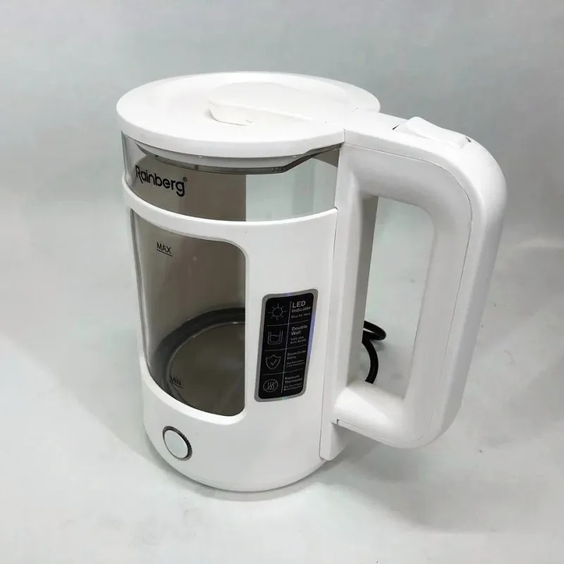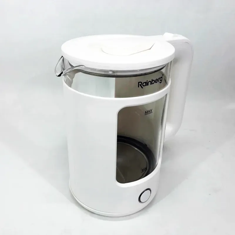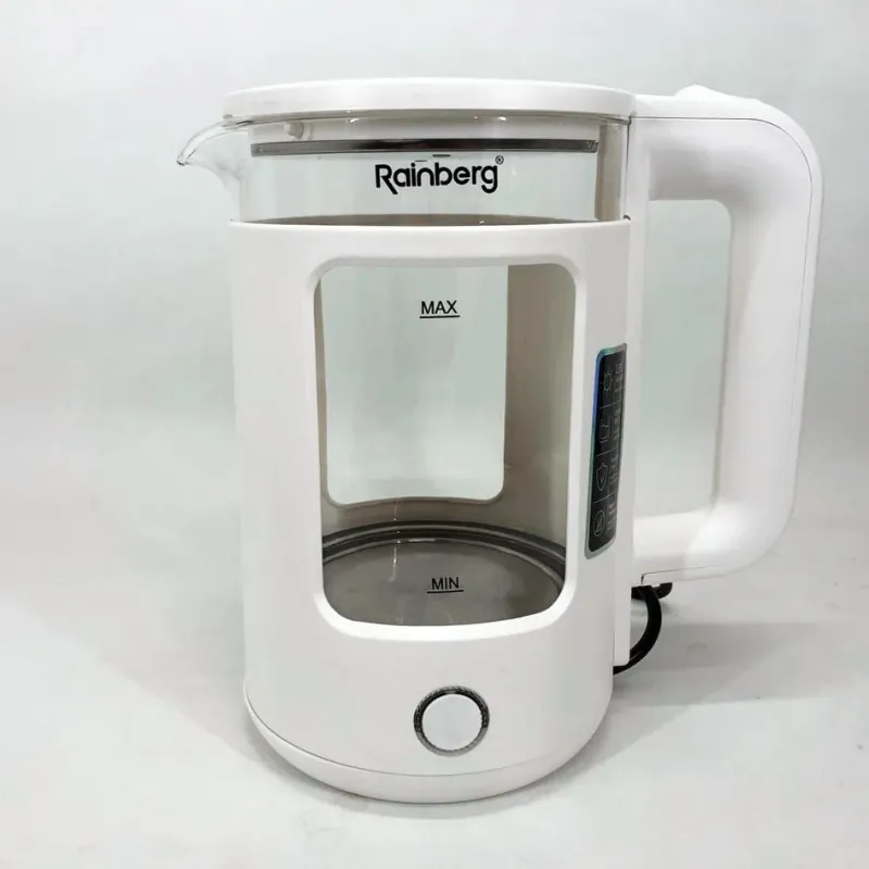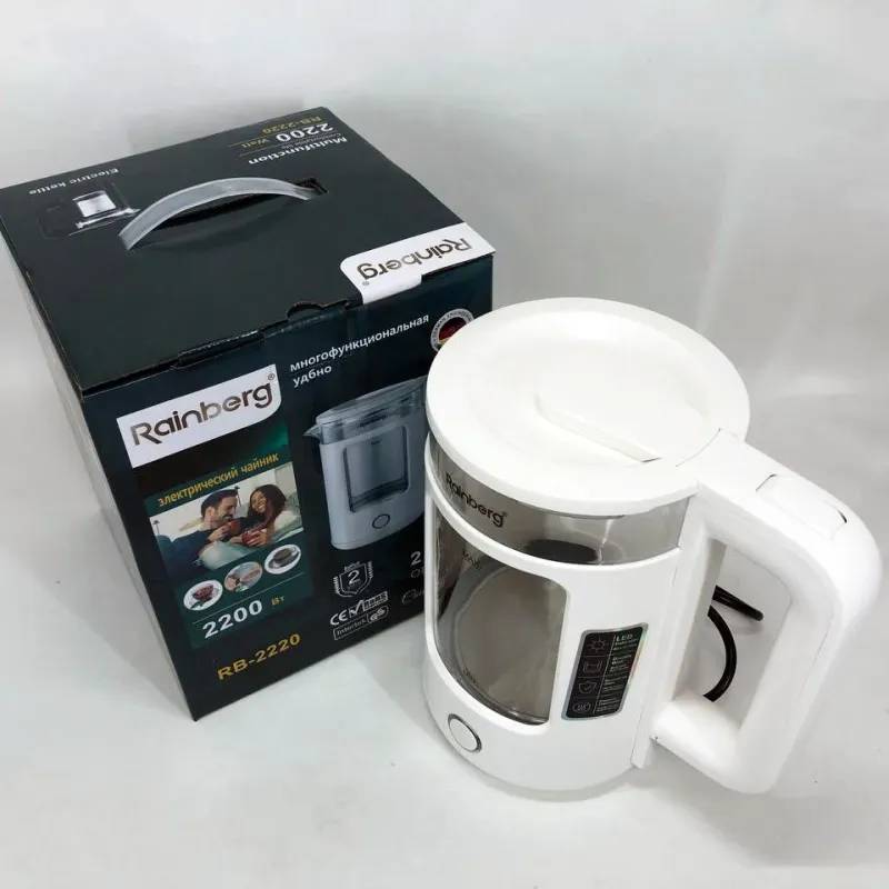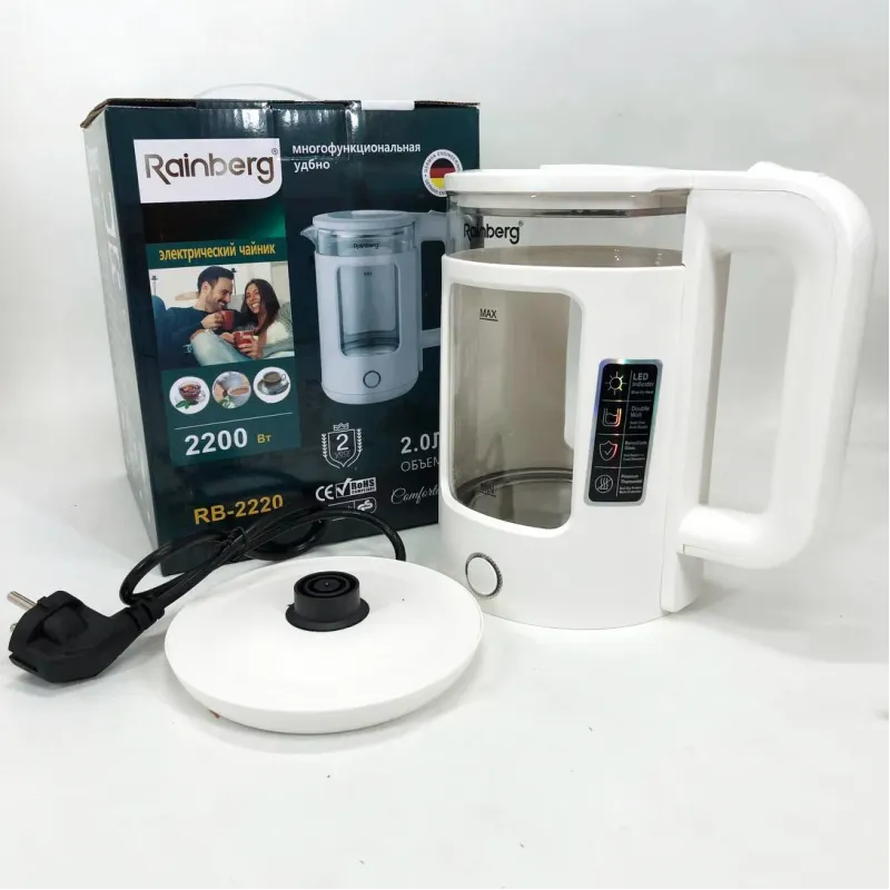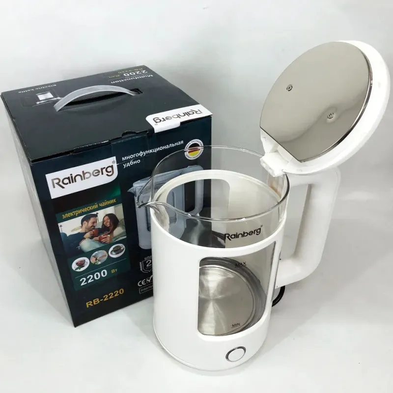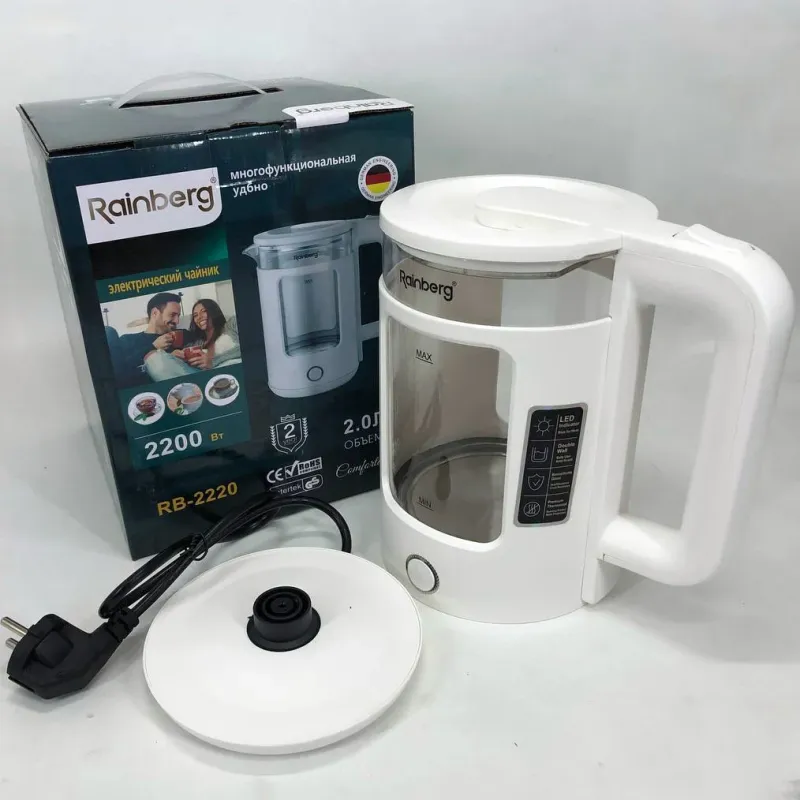 | Название | Электрочайник Rainberg RB-2220 стеклянный, дисковый прозрачный. Чайник с подсветкой 2200 Вт. Цвет: белый |