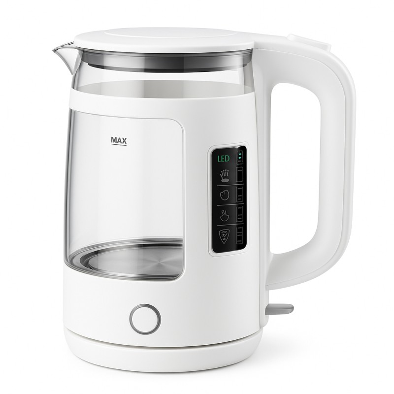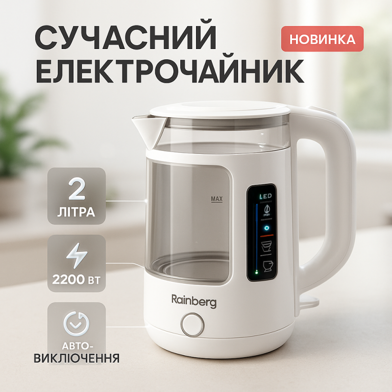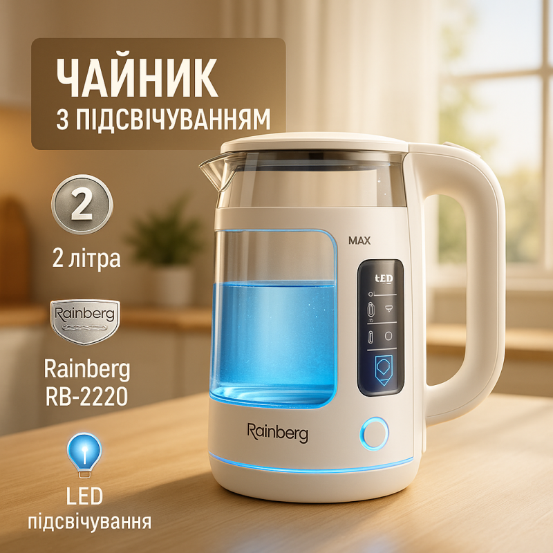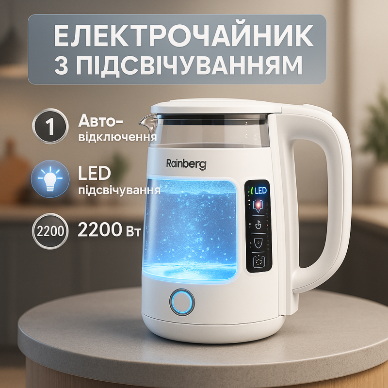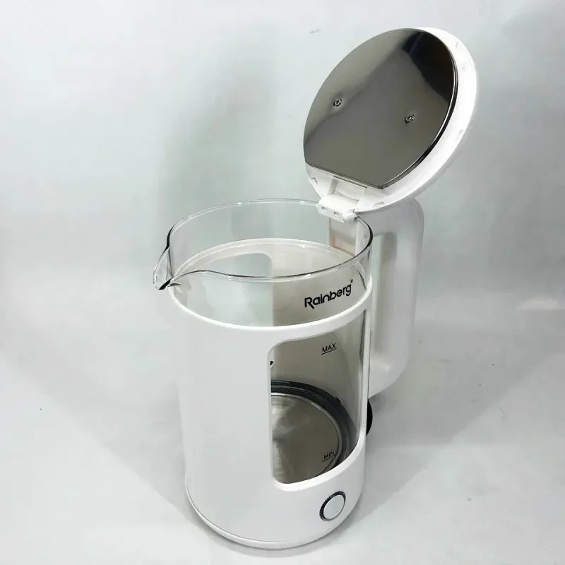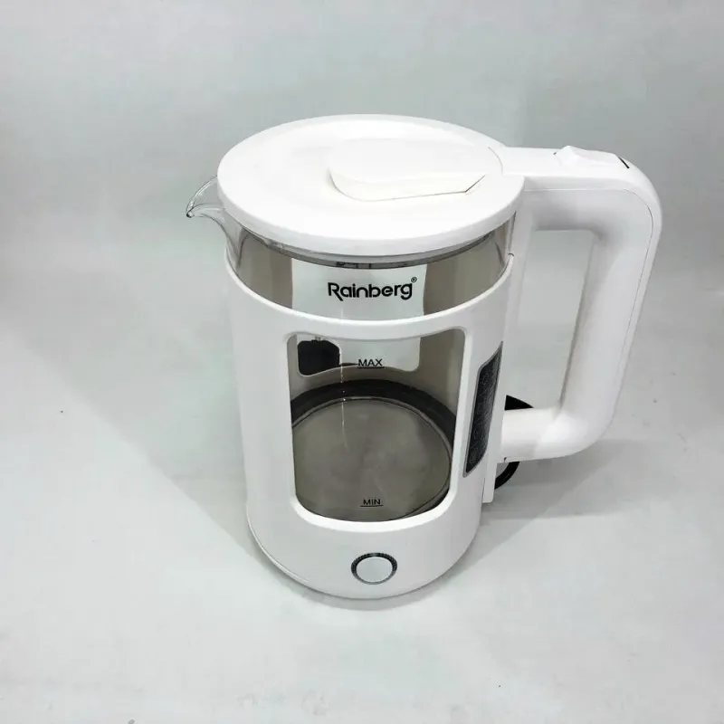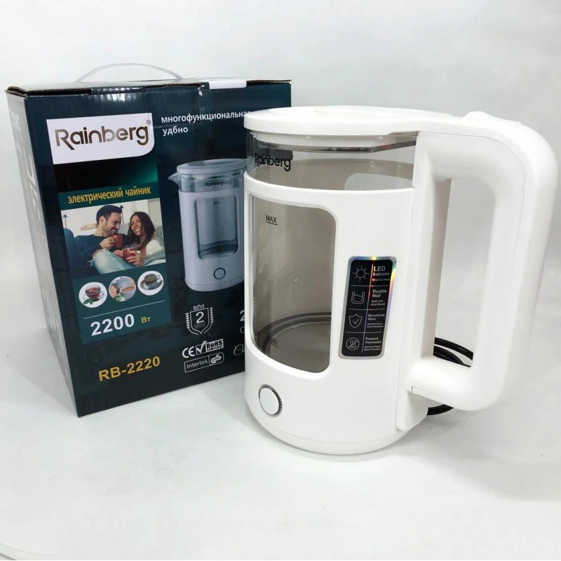 | Название | Электрочайник Rainberg RB-2220 стеклянный, дисковый прозрачный. Чайник с подсветкой 2200 Вт. Цвет: белый |