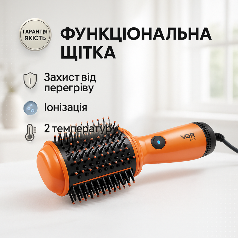 Фен-щетка для волос VGR V-497– устройство, которое может заменить одновременно плойку, утюг и фен. Он может использоваться для сушки волос и моделирования причесок, выравнивания прядей и создания эффектных укладок. Мультистайлер имеет поворотную насадку с керамическим покрытием, благодаря чему исключен перегрев и повреждение локонов.