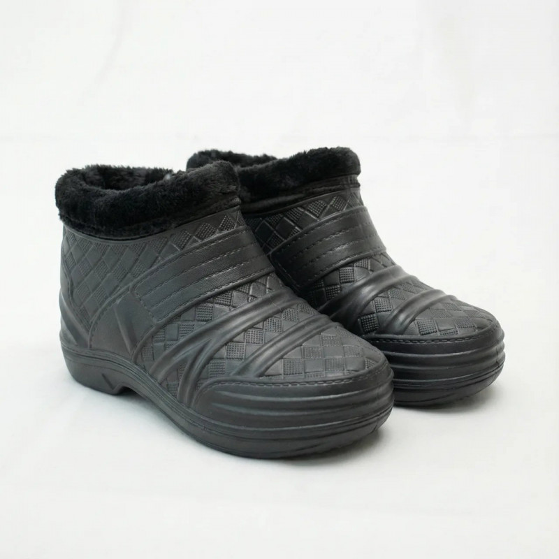 Легкие, теплые и абсолютно непромокаемые женские галоши из современного материала ЭВА (пена). Это идеальный выбор для слякотной зимы, грязи и мокрого снега. В отличие от обычной резины, пена ЭВА имеет пористую структуру, поэтому она отлично сохраняет тепло и практически не ощущается на ноге благодаря своей невесомости. Верх модели имеет стильный рельефный дизайн, имитирующий стеганую кожу, поэтому они выглядят опрятнее, чем обычные галоши. Внутри обувь утеплена густым искусственным мехом черного цвета, который выступает наружу в виде аккуратной опушки, защищая ногу от холода. Цельнолитая конструкция без швов и молний гарантирует 100% защиту от протекания. Эта обувь просто незаменима для частного дома, работы в огороде, прогулок с собакой или походов в магазин в дождливую погоду. Характеристики: Сезон: Зима / Холодная осень / Весна (слякоть) Материал верха: Пена ЭВА (EVA) — легкая и морозостойкая Материал подкладки: Искусственный мех (несъемный) Особенности: Водонепроницаемые, очень легкие Цвет: Черный Страна производитель: Украина Размеры в наличии: 37, 38, 39, 40, 41