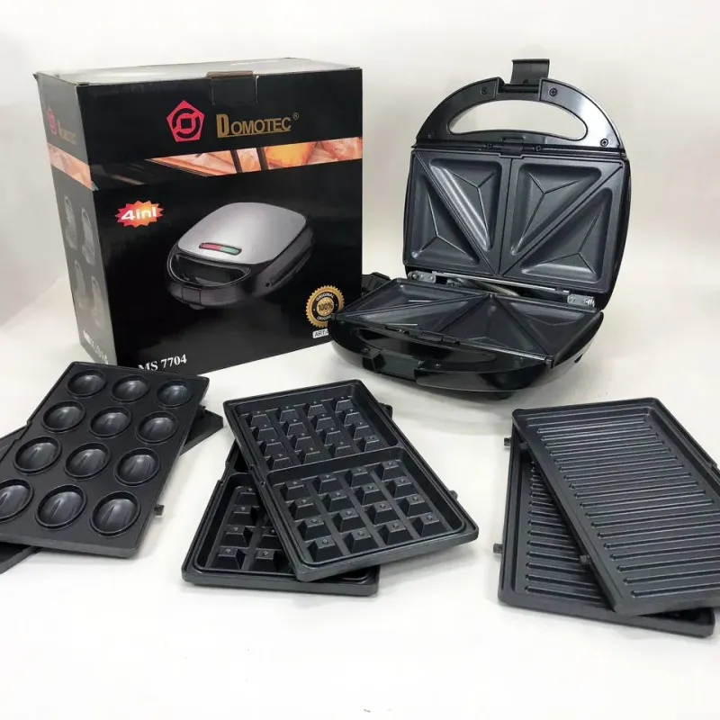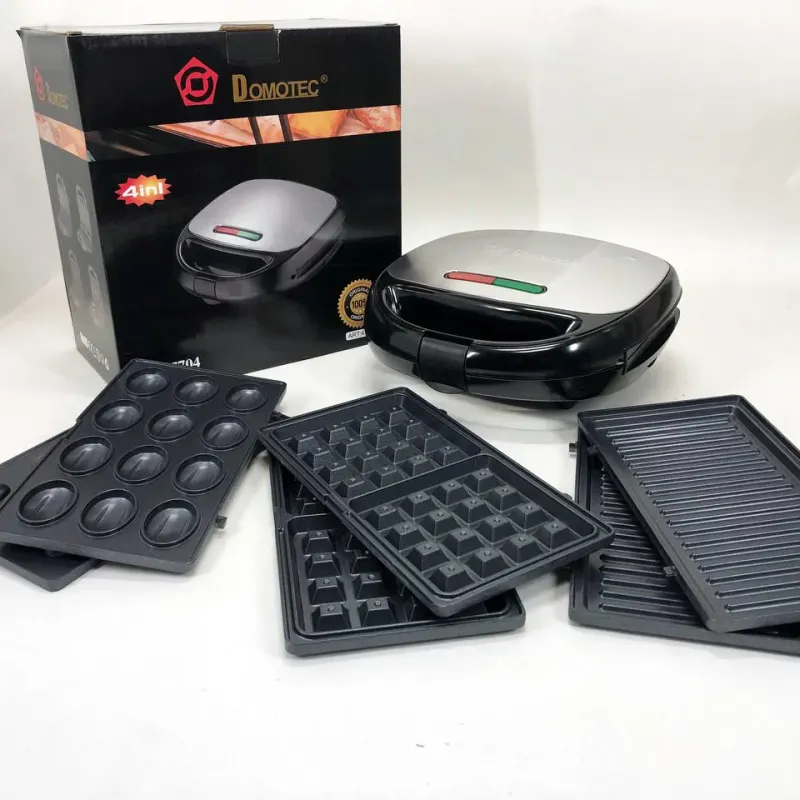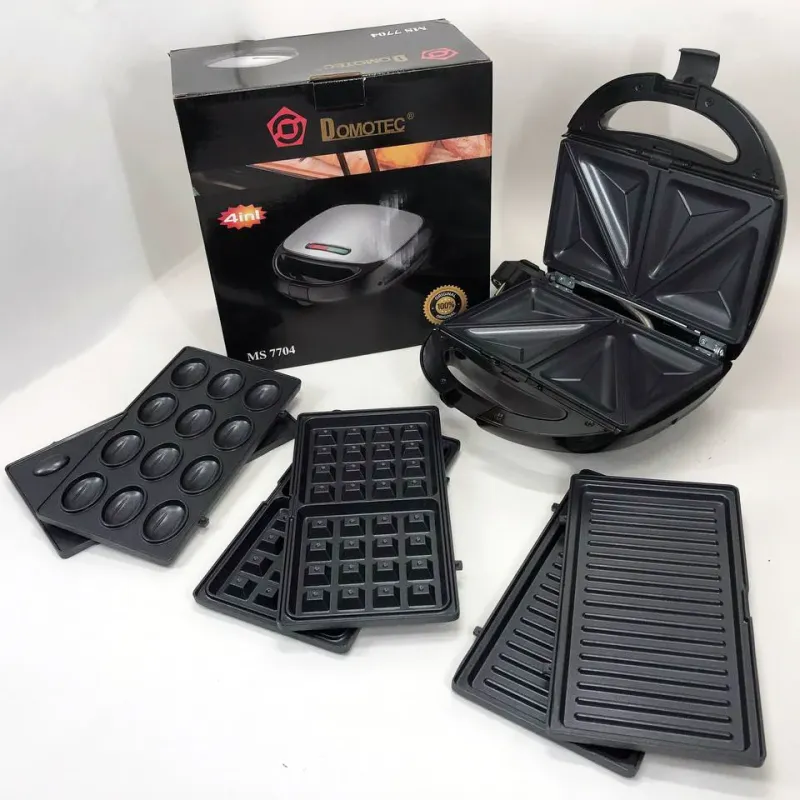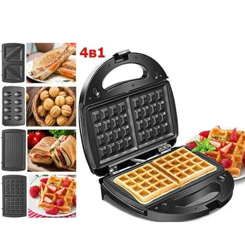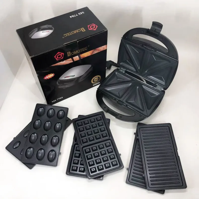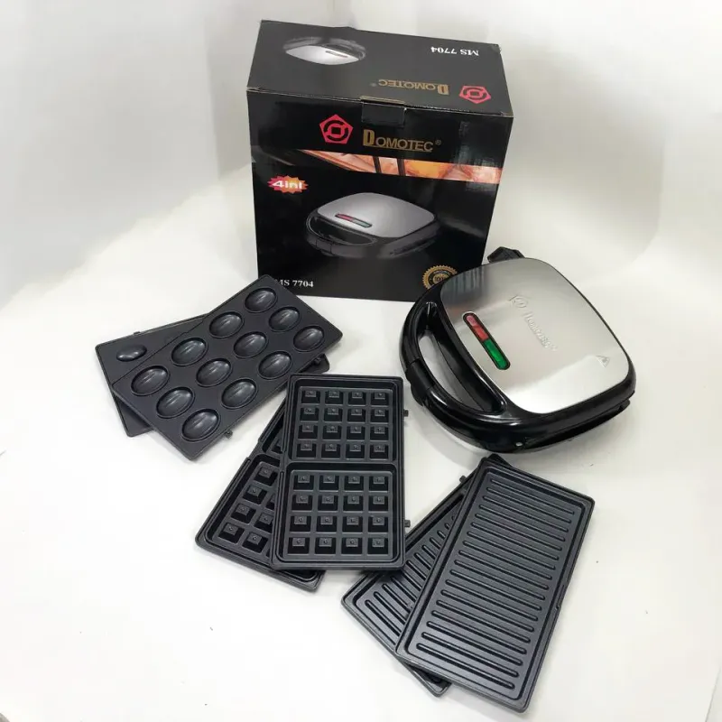 4 в 1 Гриль, бутербродница, вафельница, орешница Domotec ms 7704, 1000Вт со съемными формами: