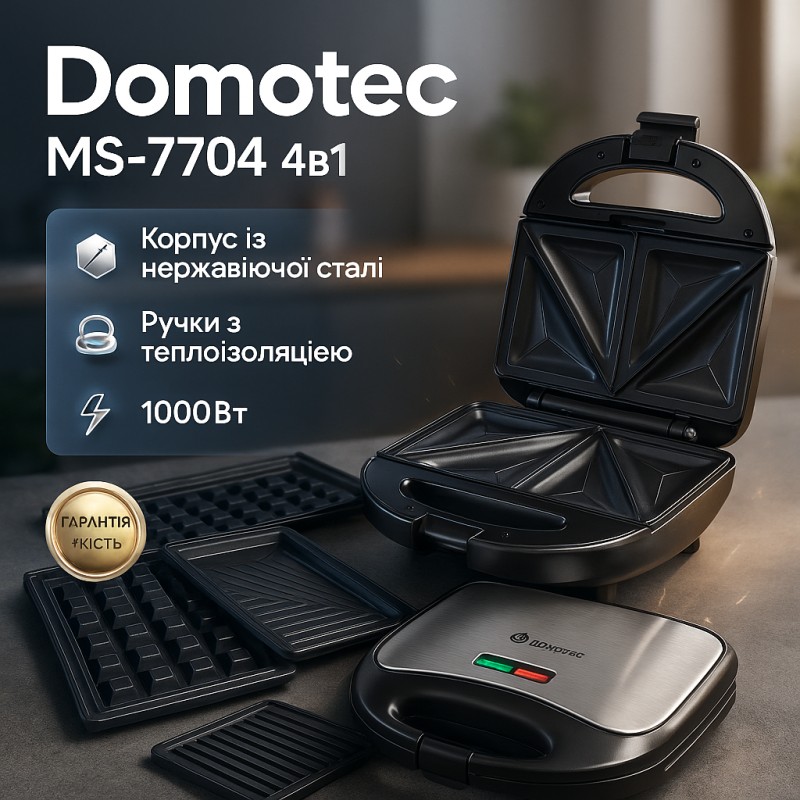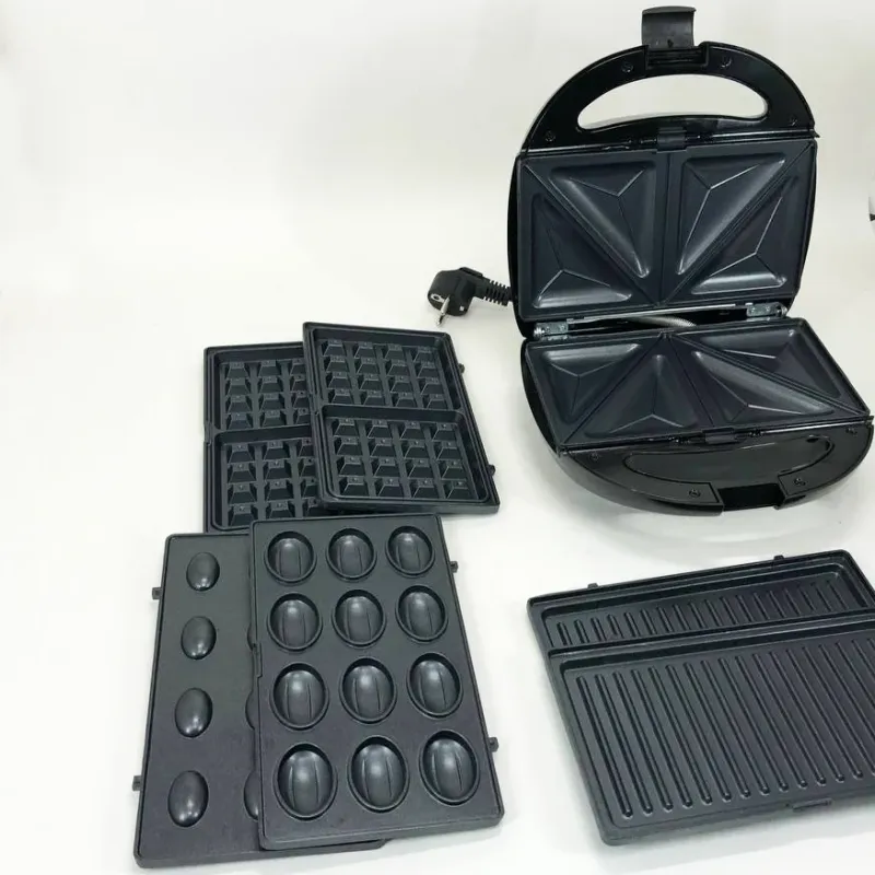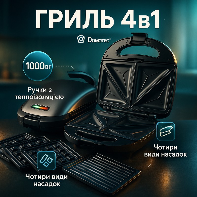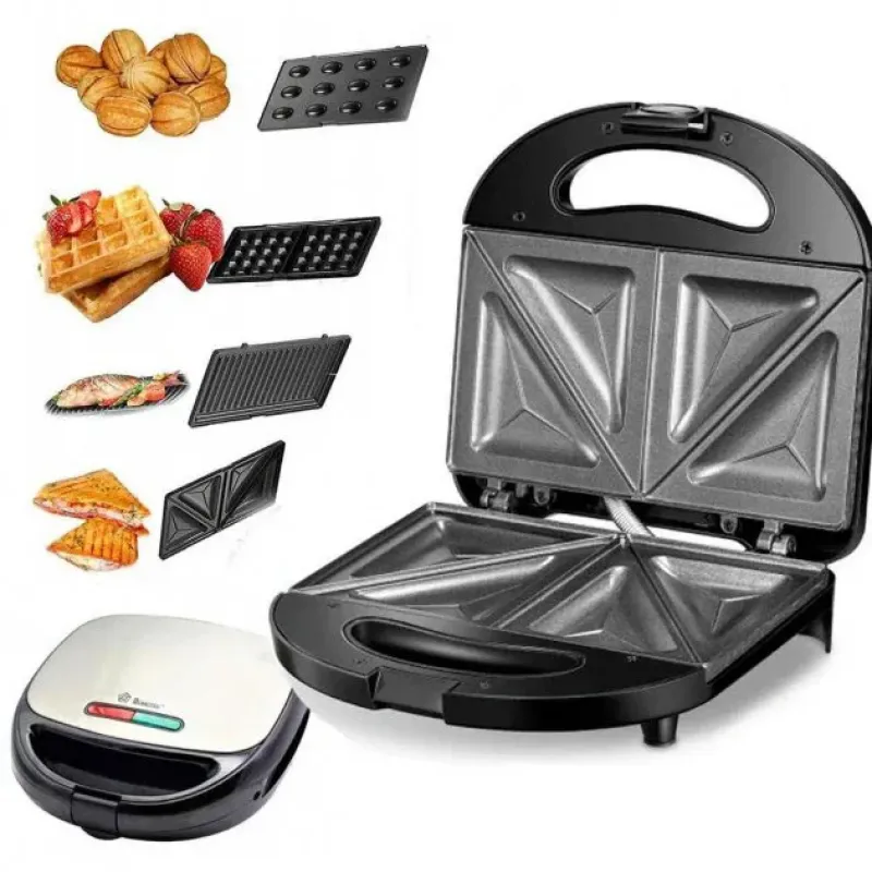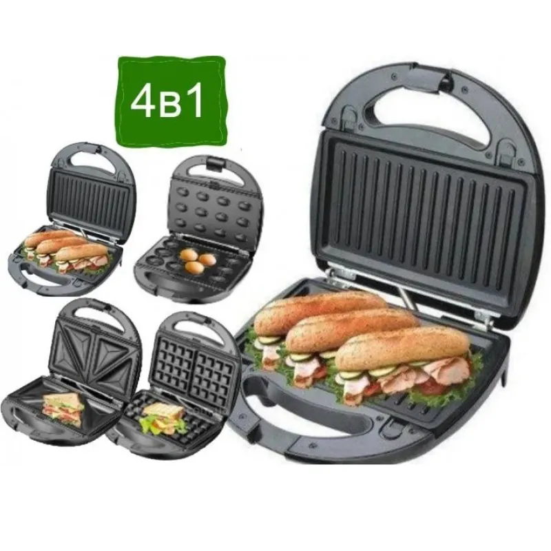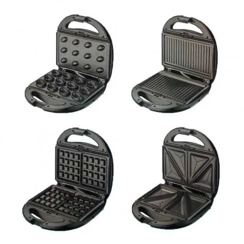 4 в 1 Гриль, бутербродница, вафельница, орешница Domotec ms 7704, 1000Вт со съемными формами: