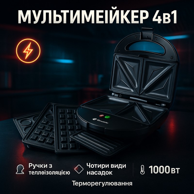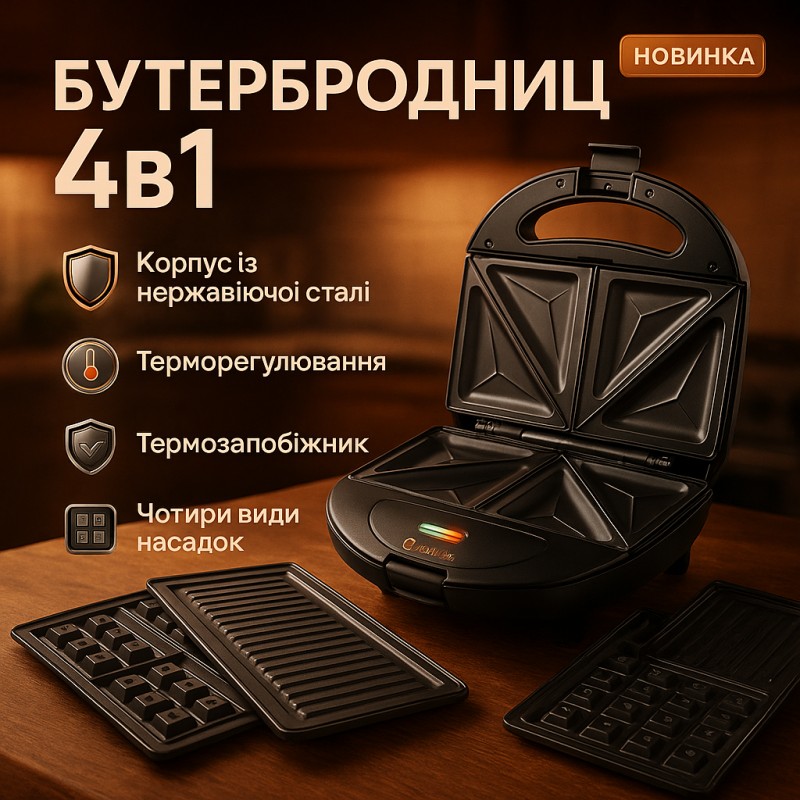 Универсальный прибор с четырьмя сменными насадками с антипригарным керамическим покрытием, сэкономит место на Вашей кухне и сделает приготовление всевозможных блюд быстрым и простым.  Выпечка происходит быстро, т.к. 1000Вт вполне достаточно для домашнего приготовления. Для каждого блюда отдельные съемные формы, что удобно при чистке вафельницы имеет световую индикацию работы, означающие готовности к выпеканию или поджариванию. С каждой стороны прибора размещены нагревательные элементы в виде пластин, которые соприкасаются с приготовляемыми продуктами сверху и снизу – это обеспечивает быструю и равномерную готовку в бутерброднице. Нет необходимости переворачивать продукты как в сковороде