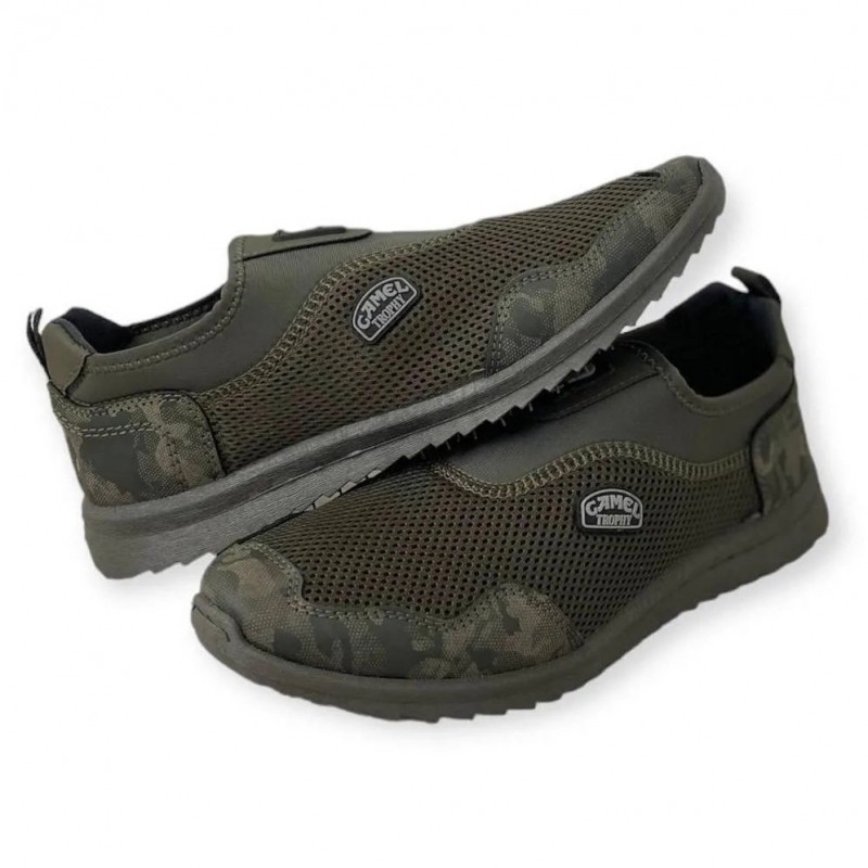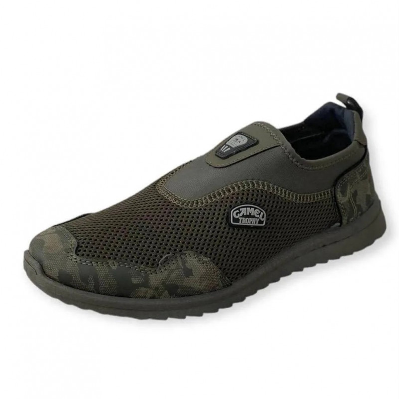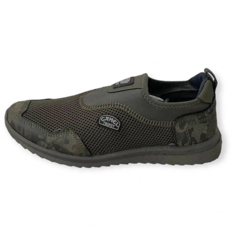 Максимальный комфорт в жару обеспечат эти мужские летние слипоны. Модель выполнена из прочной сквозной сетки, которая гарантирует идеальную вентиляцию стопы. Стильный дизайн в цвете хаки с камуфляжными вставками на носке и пятке делает эту обувь отличным выбором для поклонников стиля милитари. Главное преимущество этой модели — отсутствие шнурков. Эластичные резинки позволяют быстро обуваться и надежно фиксируют мокасины на ноге (подходят на любой подъем). Усиленные носок и задник защищают сетку от протирания и продлевают срок службы обуви. Легкая и гибкая подошва не утомляет ноги даже при длительной ходьбе. Это универсальная обувь подойдет как сменка для военных, так и для повседневной носки, вождения авто, поездок на дачу или рыбалку. Характеристики: Тип обуви: Слипоны / Мокасины / Летние туфли Материал верха: Текстильная сетка (дышащая) Материал подошвы: ПВХ (гибкая) Цвет: Хаки (Темно-зеленый) + Камуфляж Сезон: Лето Особенности: Без шнурков, логотип Camel Trophy Размеры: 41-45