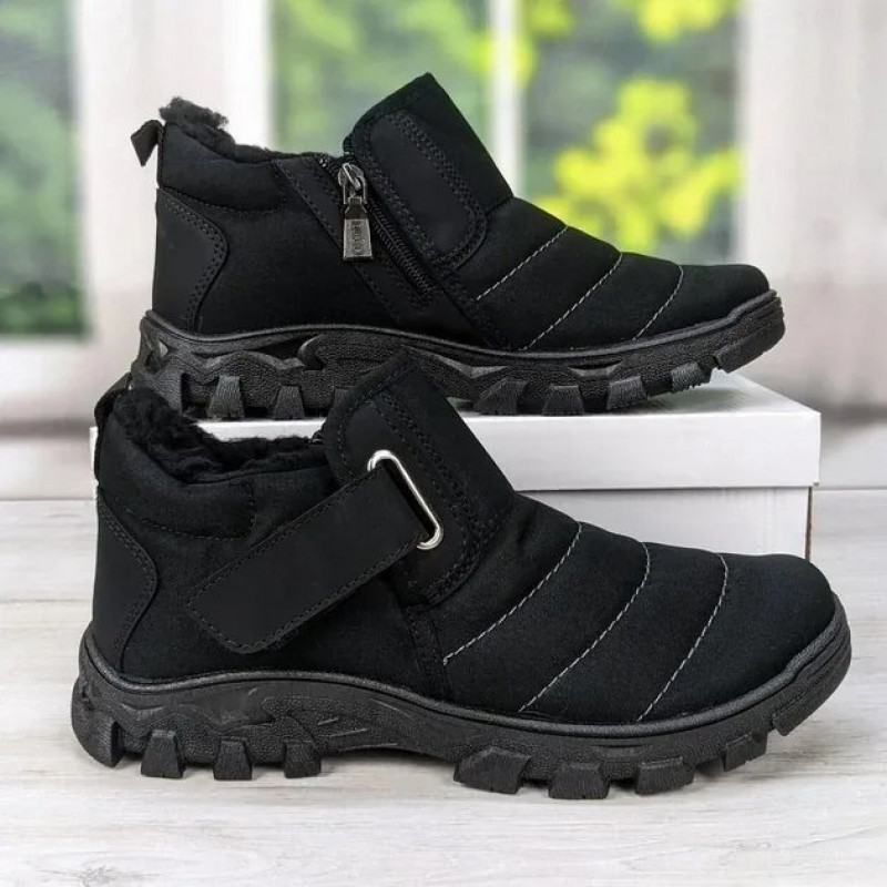 Встречайте холодное время года с комфортом в наших мужских зимних ботинках-дутиках. Эта модель разработана специально для тех, кто ценит тепло, практичность и удобство. Верх изготовлен из прочного водоотталкивающего текстиля, который надежно защищает от ветра, снега и влаги, сохраняя ноги сухими в любую погоду. Внутри ботинки утеплены густым искусственным мехом, что обеспечивает отличную терморегуляцию даже в сильные морозы. Особенностью модели является комбинированная застежка: удобная липучка позволяет отрегулировать обувь под любой подъем стопы, а боковая молния значительно ускоряет процесс обувания. Это идеальный выбор для мужчин любого возраста, благодаря легкости и мягкости изделия. Подошва выполнена из износостойкого материала с глубоким протектором, что гарантирует надежное сцепление со скользкой поверхностью и предотвращает скольжение. Черный цвет делает модель универсальной и неприхотливой в уходе — достаточно просто протереть поверхность влажной губкой. Характеристики: Сезон: Зима / Холодная осень Материал верха: Водоотталкивающий текстиль (плащевка) Материал подкладки: Искусственный мех Застежка: Липучка + Молния Цвет: Черный Размеры: 40-46 Подошва: Противоскользящая, рифленая