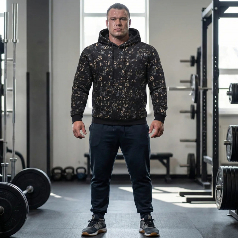 Стильное и удобное мужское худи с оригинальным принтом — базовый элемент гардероба для тех, кто ценит комфорт и современный уличный стиль. Модель представлена в широкой размерной сетке (46, 48, 50, 52), что позволяет подобрать идеальную посадку на любую фигуру. Худи выполнено в черном цвете с контрастным абстрактным узором из букв на передней части и рукавах. Спинка остается однотонной, добавляя образу лаконичности. Изделие оснащено глубоким капюшоном со шнурками и вместительным карманом "кенгуру". Эластичные манжеты на рукавах и по низу обеспечивают защиту от ветра и удобство в носке. Ткань приятная к телу, не кашлатится и хорошо переносит стирку. Характеристики: Размеры в наличии: 46, 48, 50, 52. Цвет: Черный. Декор: Принт (Тайпографика/Буквы). Фасон: Прямой крой, с капюшоном и карманом. Сезон: Весна, Осень, Зима. Стиль: Молодежный, Спортивный, Casual.