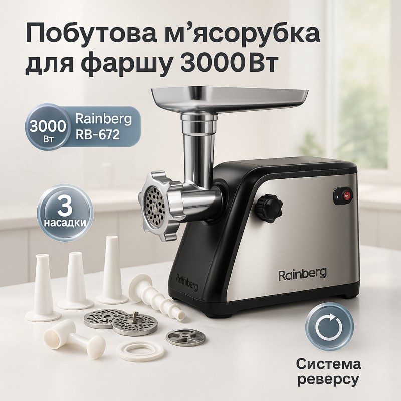 Мясорубка Rainberg RB-672 3000 Вт - это ваш надёжный напарник и помощник на кухне. Качественная и доступная по своей стоимости модель электрической мясорубки от китайской фирмы Rainberg предназначена для приготовления домашнего фарша из мяса различных видов, овощей, рыбы, а также грибов,