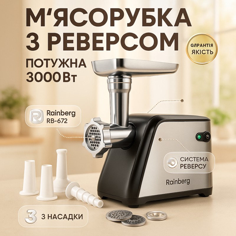 Мясорубка Rainberg RB-672 3000W электрическая с реверсом и соковыжималкой, мясорубка электрическая металл можно заказать в интернет-магазине Shtyrman. Перед покупкой проверьте модель, производителя, наличие и характеристики.