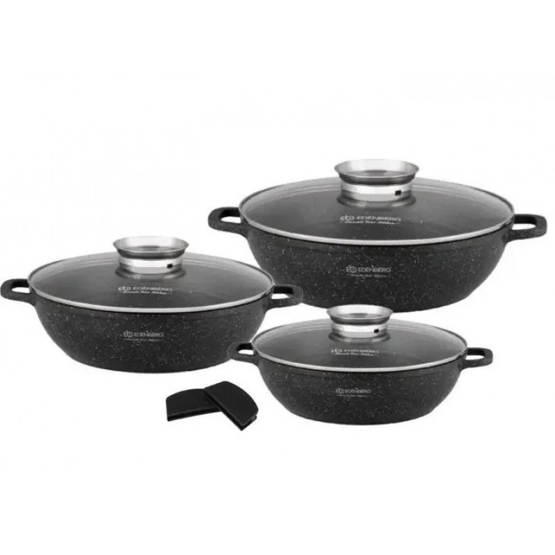 Набір кухонного посуду Edenberg EB-8160 казанів-сотейників з кришками 6 предметів мармурове покриття — полный набор для оснащения современной кухни. Качественные материалы и антипригарное покрытие для лёгкого приготовления. Равномерный нагрев дна предотвращает пригорание. Стеклянные крышки сохраняют тепло и аромат. Эргономичные ручки удобны и безопасны.