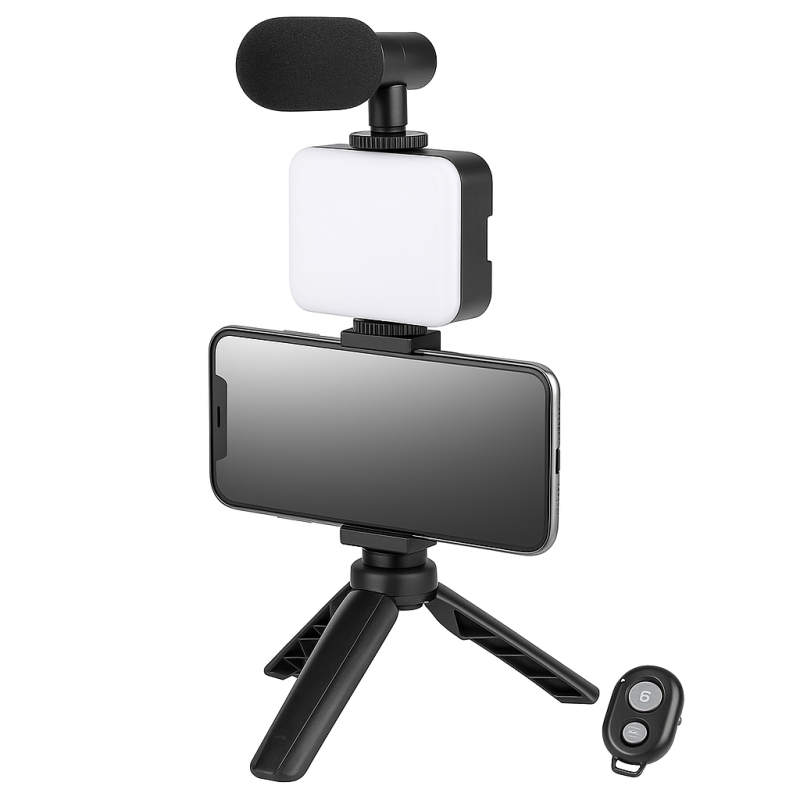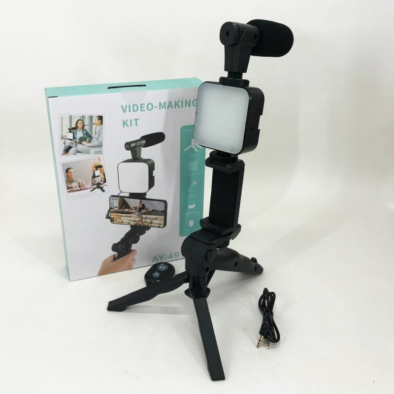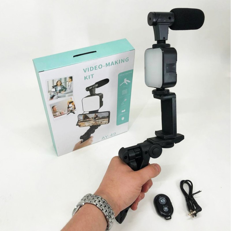 В набор входит: микрофон, подсветка, трипод, держатель для телефона и Bluetooth кнопка.