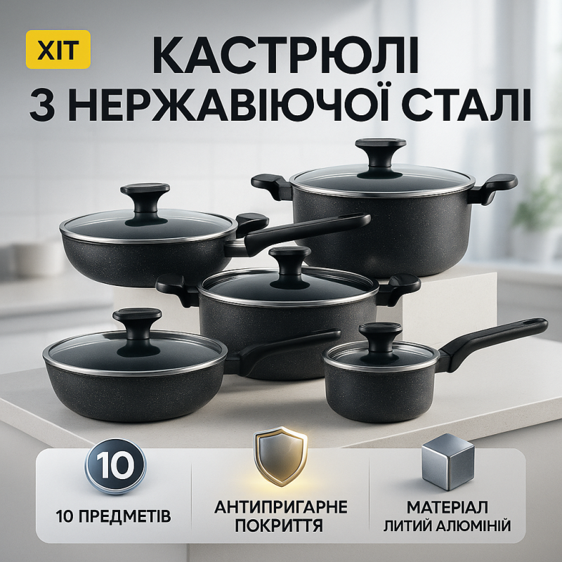 Представляем премиальный набор посуды из литого алюминия, который сочетает в себе долговечность, удобство и современные технологии покрытия. Этот комплект предназначен для тех, кто стремится к эффективному и здоровому процессу готовки без компромиссов в качестве и комфорте. Благодаря инновационным материалам и продуманной конструкции, посуда облегчает приготовление разнообразных блюд, поддерживая максимальную практичность в использовании.