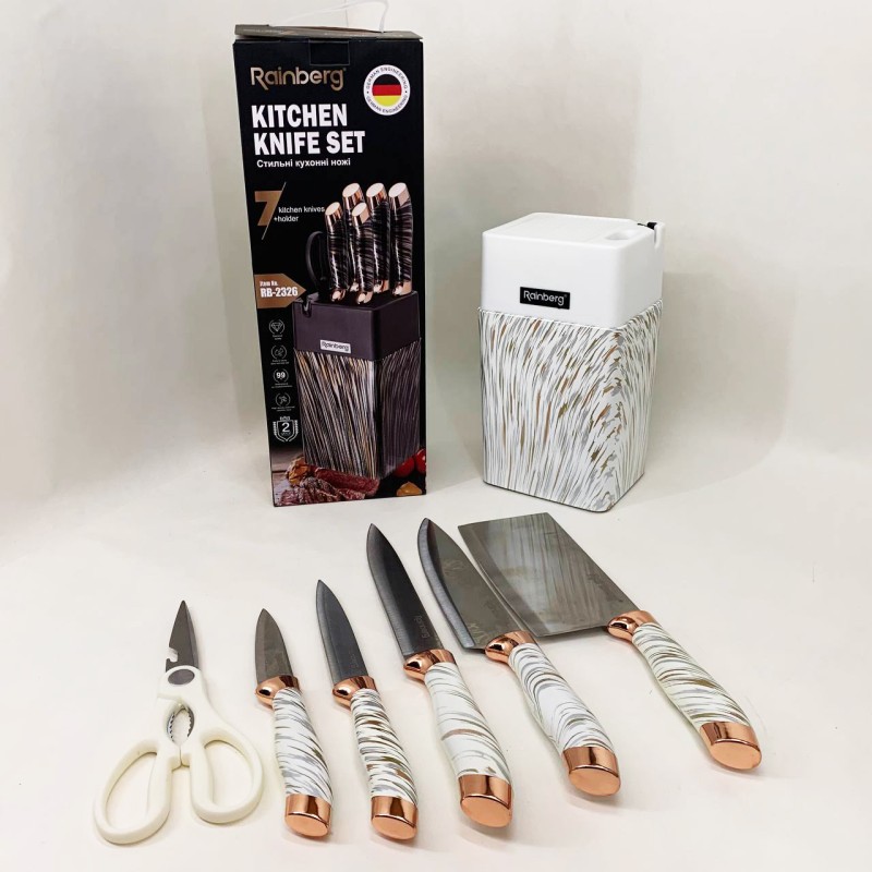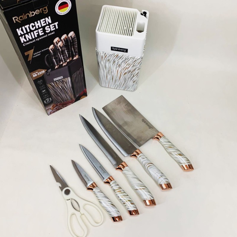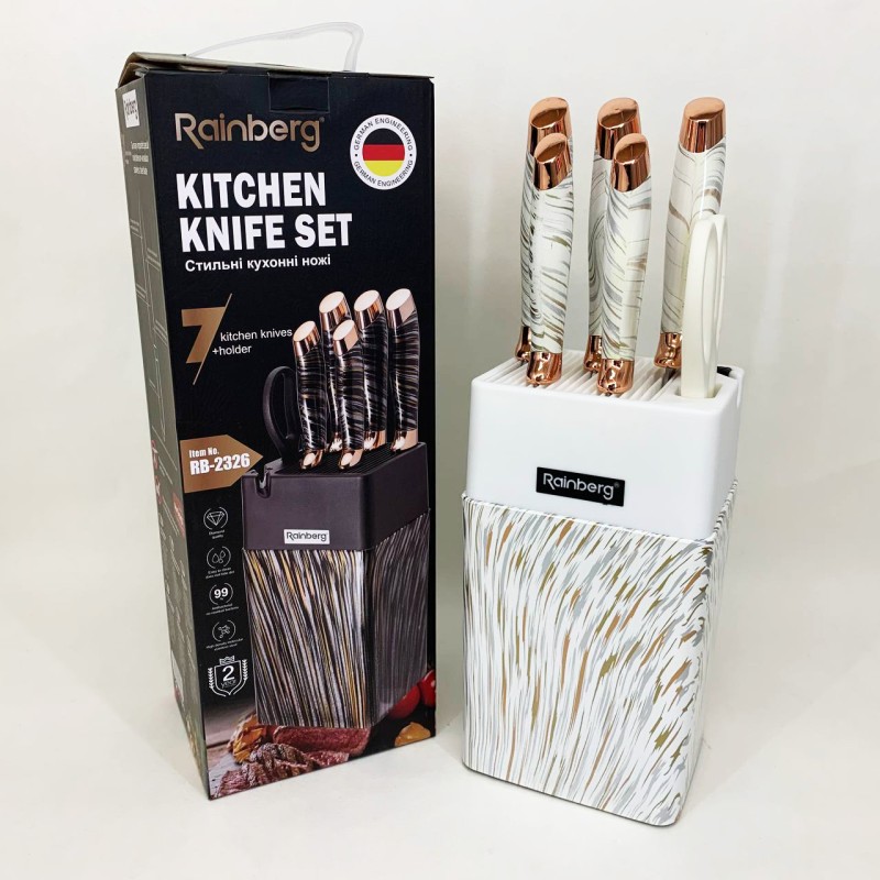 Набор ножей Rainberg RB-2326 – это сочетание элегантного дизайна и высокой функциональности. Стильные мраморные ручки с золотистыми акцентами выглядят изысканно, а удобная подставка обеспечивает компактное хранение всех элементов. В наборе 7 предметов: 5 кухонных ножей для разных задач, ножницы и фирменная подставка.