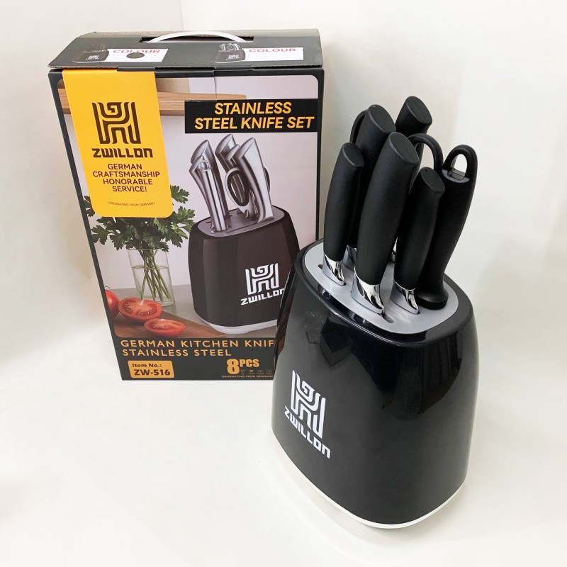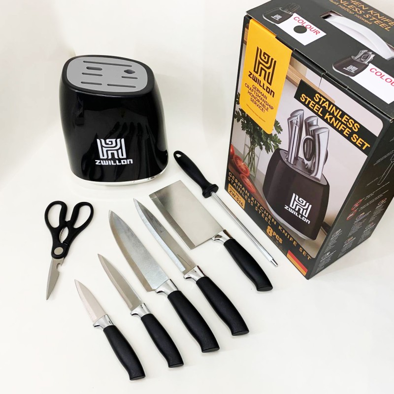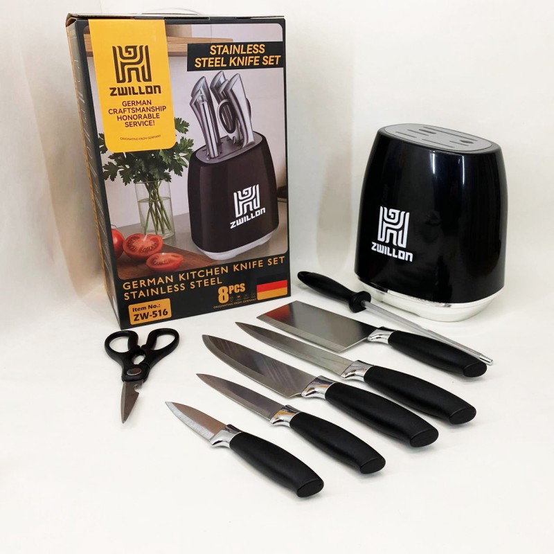 Лезвия изготовлены из нержавеющей стали, а эргономичные ручки обеспечивают комфортную работу даже во время длительного использования. Надежная подставка с фиксацией позволяет держать все необходимое под рукой, не занимая много места. Rainberg RB-2330 – это идеальный выбор для тех, кто ценит качество, функциональность и современный дизайн.