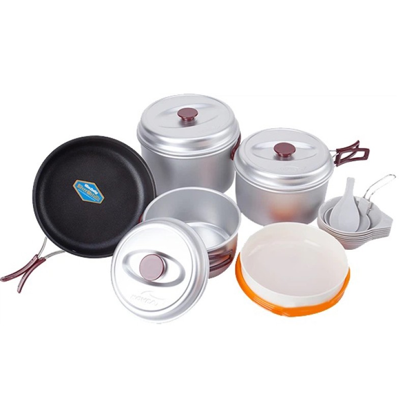 Набор легкой производной посуды из алюминия Kovea KSK-WY78 Silver 78, рассчитанный на семь-восемь человек. Набор состоит из трех кастрюль объемом 4,2 литра, 2,8 литра и 1,8 литра, удобной сковороды, 4 тарелок, 5 чашек, судка, дуршлаг, лопатки и складной черпачка. Кастрюли и сковорода не имеют пластиковых деталей, в связи с чем их можно легко ставить на открытый огонь или в уголь, не опасаясь оплавления и деформации.
