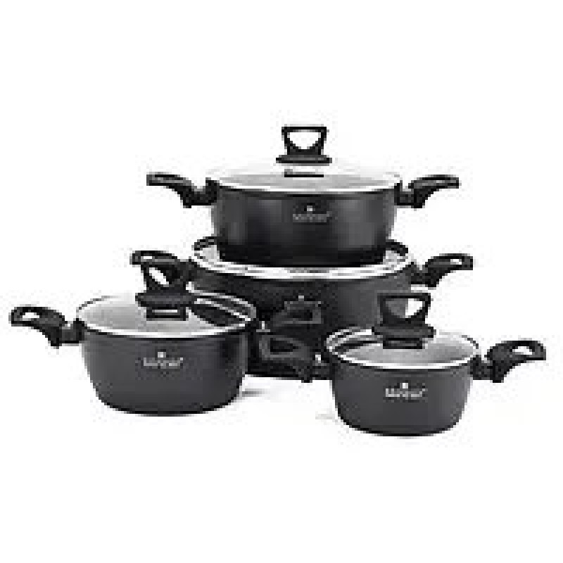 Мармурове антипригарне покриття забезпечує легке приготування без пригорання. Алюмінієвий корпус з посиленим дном рівномірно розподіляє тепло. Повний набір з каструль різного розміру та кришок закриває всі потреби на кухні.