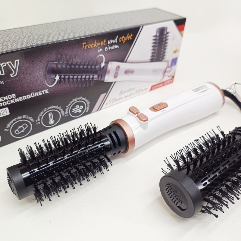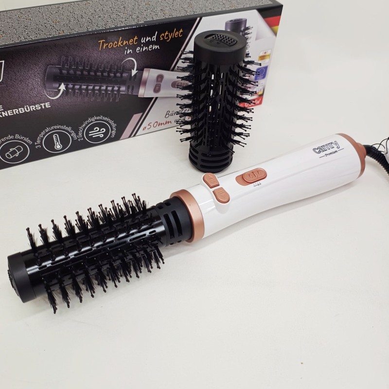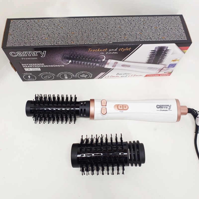 Роторная плойка/фен Camry CR 2021 – отличный выбор для дамы, которая хочет подчеркнуть красоту своих волос. Элегантная плойка с 2 сменными щеточками разного размера. Благодаря 3 температурным режимам и мощности 1200 Вт позволяет как фиксировать локоны, так и создавать их на абсолютно прямых волосах. Очень удобно благодаря шарнирному соединению шнура и специальной петле для подвешивания. Благодаря этому вы можете легко добиться профессионального эффекта, как от парикмахерской, даже в домашних условиях.