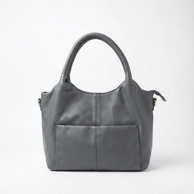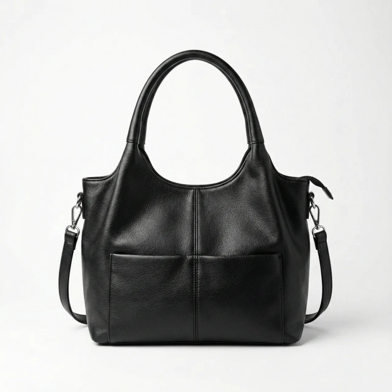 Эта черная сумка — воплощение практичности и универсального стиля. Модель идеально подходит для женщин, которые ценят комфорт и порядок в вещах. Изготовленная из качественной эко-кожи с приятной зернистой фактурой, она выглядит сдержанно, но дорого, и подойдет к любой верхней одежде — от пуховика до кашемирового пальто. Изюминкой модели являются два удобных открытых кармана на лицевой стороне. Это идеальное решение для хранения мелочей, которые всегда должны быть под рукой: телефона, антисептика, бумажных платочков или проездного. Декоративный центральный шов добавляет сумке структурированности и современного вида. Сумка оснащена прочными ручками оптимальной длины, что позволяет удобно носить ее на плече. Основное отделение закрывается на молнию, внутри достаточно места для ежедневных необходимых вещей. На обратной стороне расположен дополнительный карман на застежке. Характеристики: Материал: Эко-кожа (мягкая, зернистая) Цвет: Черный (Black) Тип: Тоут / Повседневная Особенности: Два накладных кармана спереди Застежка: Молния Размер: Средний (вмещает формат А5+) Стиль: Кэжуал / Классика