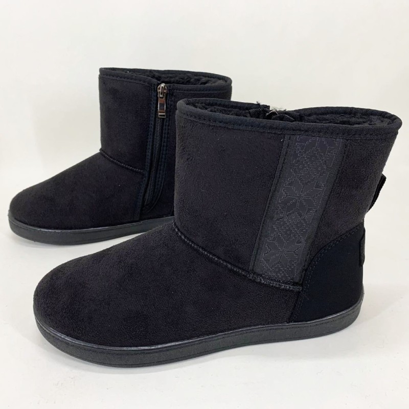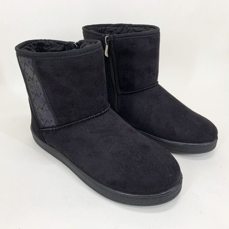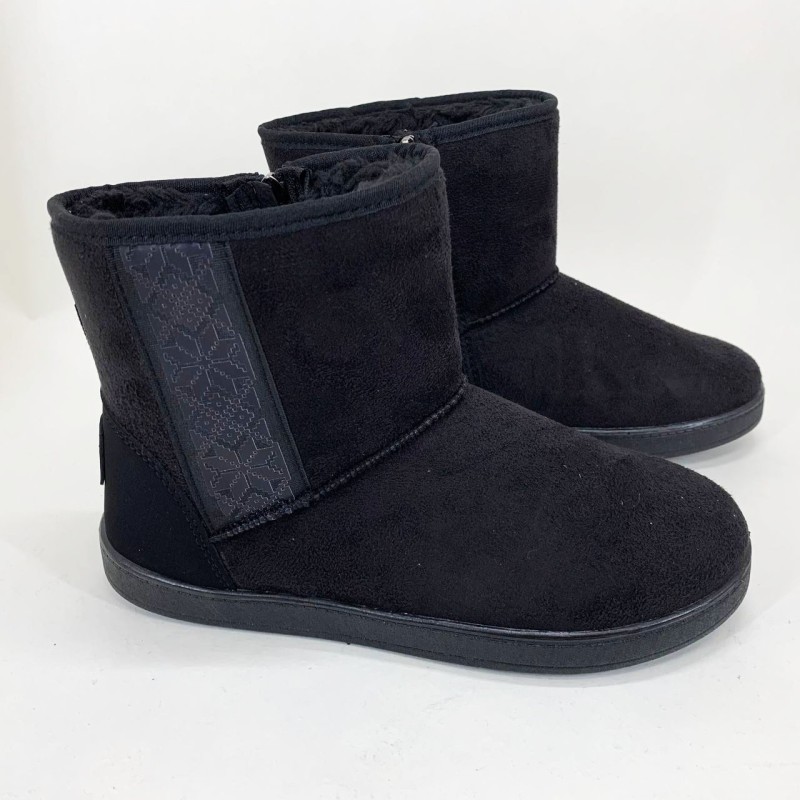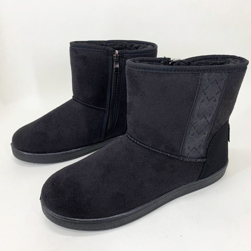 Утепленные женские угги — это обувь, сочетающая уют, тепло и лаконичный стиль. Модель выполнена в глубоком черном цвете из мягкого текстиля под замшу, что придает образу элегантности. Декоративная вставка с узором на голенище создает аккуратный акцент и придает обуви индивидуальность. Идеально подходит для ежедневного ношения в холодное время года.