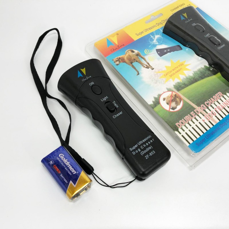 Отпугиватель собак ZF853E/5039 Super Ultrasonic Dog Chaser — это универсальный прибор, который выполняет функции защиты от злых и агрессивных собак, а также дрессировки собак. Данное устройство также можно использовать как фонарь, который способен светить на расстоянии до 25 метров. Свет обеспечивается двумя светодиодами, расположенными на торце устройства.