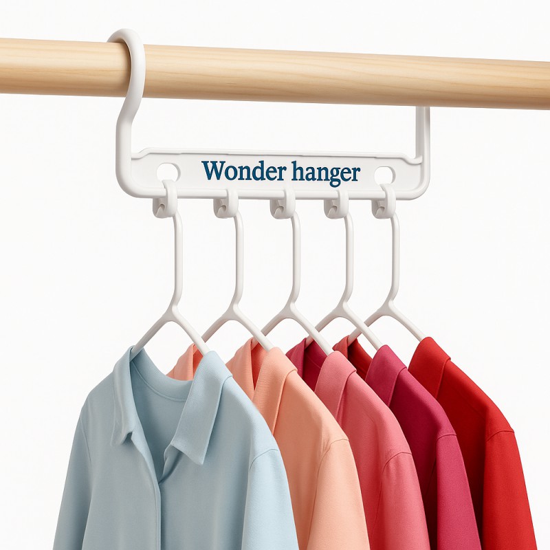 Вещи надежно удерживаются зажимами, юбки вешаются на специальные петли. Универсальная вешалка требует минимум места в шкафу и при транспортировке. В одном наборе содержится восемь вешалок. Каждая вешалка имеет пять небольших перекладин. Чтобы разместить одежду на Wonder Hanger , необходимо выдвинуть перекладину.