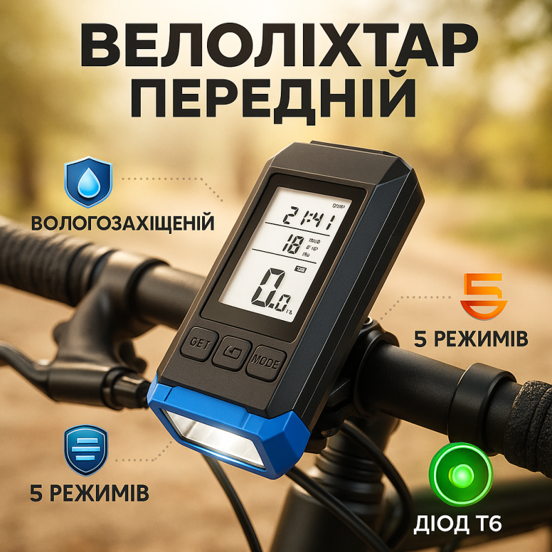 | Название | Велофара с компьютером и сигналом MT-088-T6, 450Lum, 18650 (2200mAh), кнопка, Освещение для велосипеда |
