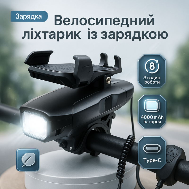 Фонарь оснащён встроенным литий-ионным аккумулятором ёмкостью 4000 мАч, который заряжается через разъём Type-C. Благодаря функции Power Bank устройство можно использовать для подзарядки мобильных гаджетов в дороге. Велофонарь крепится к рулю с помощью пластикового хомута, обеспечивая надёжную фиксацию.Выносная кнопка позволяет управлять режимами освещения и подавать звуковой сигнал, не отвлекаясь от вождения.