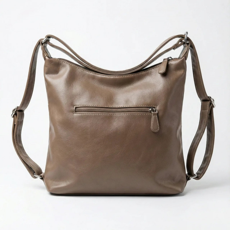 Эта стильная сумка-рюкзак цвета "Мокко" (коричневый) — идеальное решение для активных женщин, ценящих практичность. Уникальная конструкция "трансформер" позволяет менять способ ношения за считанные секунды: используйте ее как элегантную сумку на плече или как удобный рюкзак за спиной, чтобы освободить руки. Модель выполнена из мягкой, но прочной эко-кожи с глянцевым эффектом, что придает изделию дорогой вид. Главным украшением фасада является объемный накладной карман со стильным металлическим поворотным замком — идеальное место для вещей, которые должны быть под рукой. Дополнительные вертикальные карманы на молниях по бокам добавляют функциональности и шарма. Основное отделение надежно закрывается на молнию. Внутри достаточно места для планшета, кошелька, блокнота и косметички. На тыльной стороне расположен потайной карман на молнии для самых ценных вещей. Характеристики: Материал: Качественная эко-кожа (мягкая, гладкая) Цвет: Коричневый / Мокко Тип: 2 в 1 (Сумка-Рюкзак трансформер) Застежка: Молния (основная), Поворотный замок (передний карман) Количество карманов: Основное отделение, фронтальный карман с клапаном, боковые вертикальные карманы, задний карман Стиль: Городской / Casual