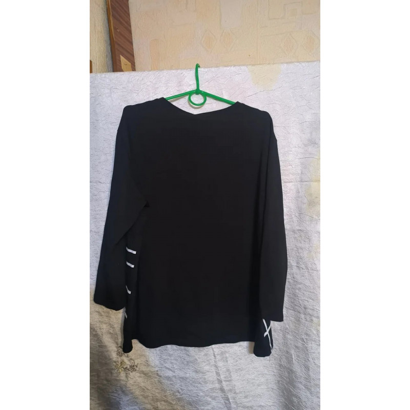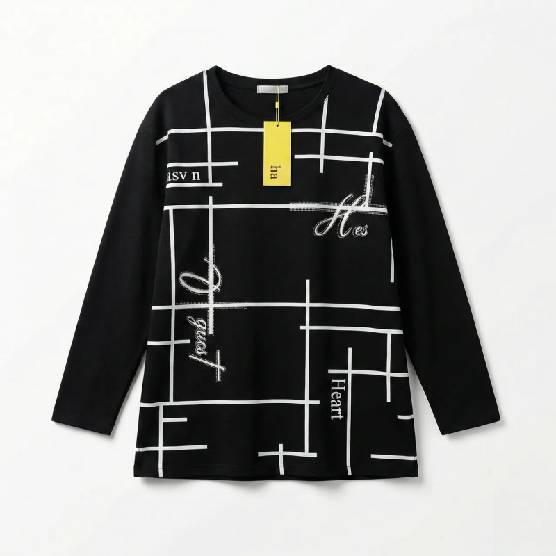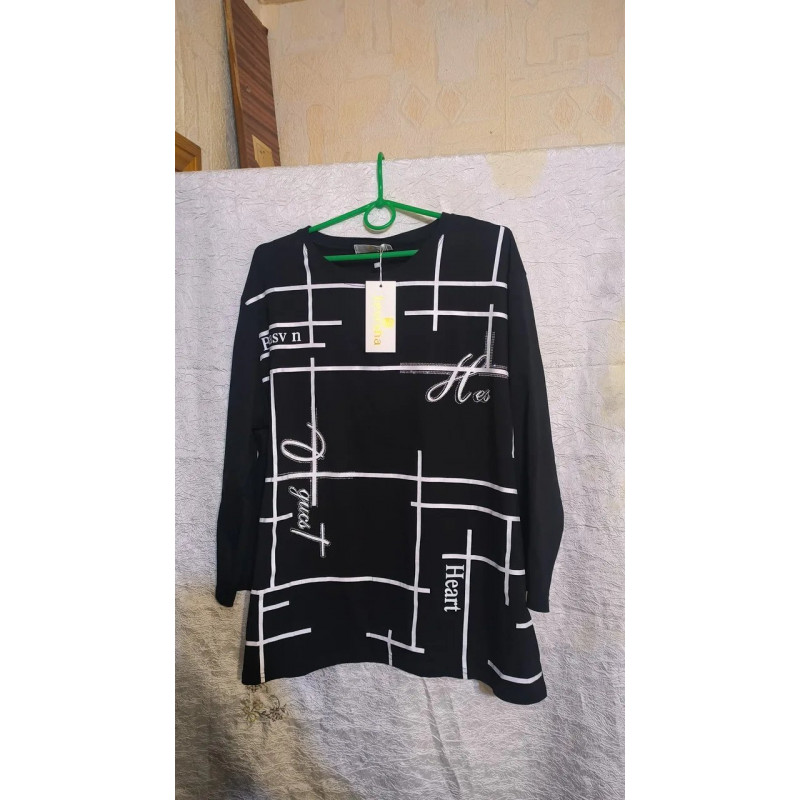 Эффектная женская туника в классическом черном цвете, украшенная стильным геометрическим принтом в виде белых линий (крупная клетка). Такой дизайн не только выглядит современно, но и визуально структурирует фигуру, скрывая недостатки. Особый шарм изделию придают оригинальные надписи ("Heart", "August") и декор из мерцающих страз на тексте, что делает кофту отличным вариантом как для офиса, так и для праздничного выхода. Модель имеет комфортный удлиненный крой (туника), который идеально подходит для женщин с пышными формами (батал). Рукав длинный, горловина круглая. Ткань мягкая, приятная к телу, красиво ниспадает и не сковывает движений. Это универсальная вещь, которая легко сочетается с классическими брюками или лосинами. Характеристики: Тип изделия: Туника / Удлиненный джемпер Цвет: Черный с белым принтом Декор: Геометрический принт, надписи, стразы Рукав: Длинный Сезон: Весна / Осень Состояние: Новое