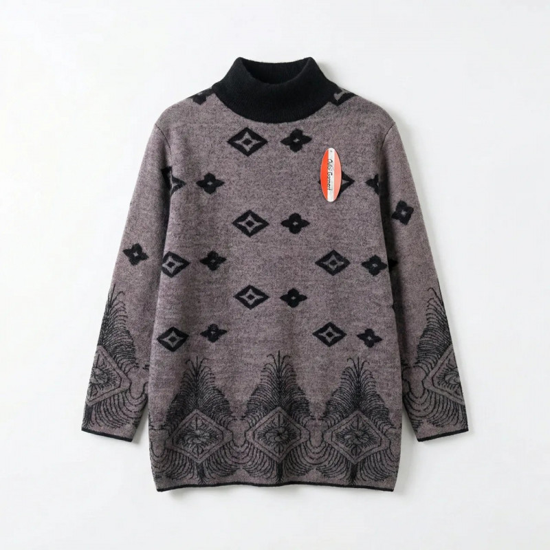 Стильная и теплая женская туника из ангоры в изысканном серо-лиловом цвете (темная пудра) — настоящая находка для зимнего гардероба. Модель сочетает в себе элегантность и комфорт: удлиненный фасон идеально подходит для носки с лосинами или узкими брюками, визуально вытягивая силуэт и скрывая недостатки. Изделие украшено контрастным черным орнаментом в виде ромбов и утонченного узора "перья" по низу. Особый шарм добавляет черный пушистый воротник-стойка и отделка манжетов, что делает образ завершенным. Мягкая, приятная на ощупь ткань с добавлением ангоры отлично согревает, не колется и дарит ощущение уюта. Характеристики: Размеры в наличии: 52, 54, 56 (Батал). Цвет: Серо-лиловый (Тауп/Темная пудра) с черным. Материал: Ангора, шерсть, акрил. Фасон: Удлиненный (туника), А-силуэт. Декор: Геометрический принт, пушистый ворс на воротнике. Сезон: Зима, Холодная осень.