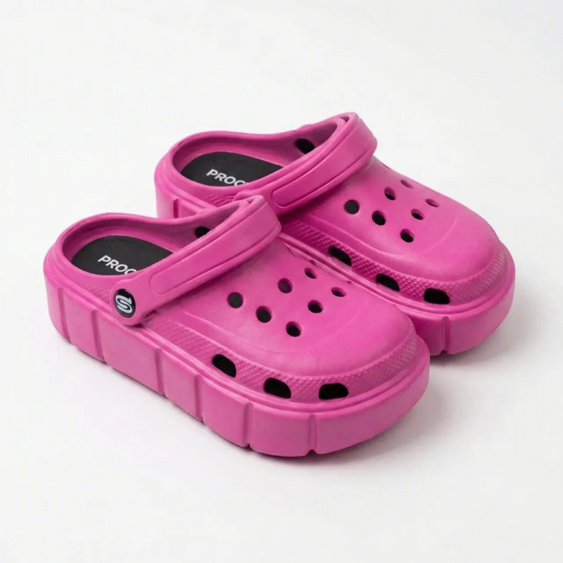 Добавьте ярких красок в свое лето с этими стильными розовыми кроксами на высокой платформе!. Эта трендовая модель создана для тех, кто любит выделяться и ценит комфорт. Массивная подошва не только добавляет модный акцент вашему образу, но и визуально делает ножки стройнее, обеспечивая при этом отличную амортизацию при ходьбе. Обувь изготовлена из современного материала — пены EVA, который отличается невероятной легкостью, прочностью и эластичностью.. Сабо практически не ощущаются на ноге, а специальная текстура стельки создает легкий массажный эффект. Материал гигиеничный, не впитывает влагу и запахи, легко моется и быстро сохнет, что делает эти кроксы идеальным вариантом для пляжа или бассейна. Продуманный дизайн с вентиляционными отверстиями обеспечивает свободную циркуляцию воздуха, позволяя ногам "дышать" даже в самую сильную жару. Поворотный ремешок с фирменным логотипом позволяет носить модель как классические шлепанцы или надежно зафиксировать ее на пятке для более активного движения. Эти универсальные и практичные сабо станут вашей любимой обувью для прогулок по городу, отдыха на природе или даче. Характеристики: Материал: Пена ЭВА (EVA) Цвет: Розовый (яркий) Тип: Сабо / Кроксы на платформе Пол: Женские Сезон: Лето Особенности: Высокая подошва, поворотный ремешок Размеры: 36-41