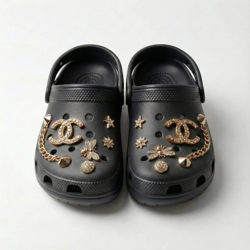 Элегантные черные сабо с золотыми украшениями (джиббитсами) и массивной цепочкой. Практичный цвет, легкая подошва EVA. Хит сезона. Размеры 36-41. Полное описание: Если вы ищете обувь, которая сочетает максимальный комфорт и роскошный вид, эти черные сабо — ваш идеальный выбор. Глубокий черный цвет создает идеальный фон для золотого декора, заставляя его сиять еще ярче. Эта модель не только красива, но и мега-практична. На черном цвете меньше заметна пыль, поэтому они идеально подходят для ежедневной носки по городу, на даче или пикнике. Преимущества модели: Стиль "Black & Gold": Классическое сочетание черного и золотого выглядит дорого и подходит почти к любой одежде. Практичность: Менее маркие, чем белые аналоги, легко моются водой. Комфорт: Упругий материал EVA амортизирует шаги, снимая усталость с ног. Характеристики: Тип: Сабо / Кроксы Материал: Пена (EVA) Цвет: Черный Декор: Золотистая цепочка, фигурные джиббитсы (съемные) Размеры: 36-41