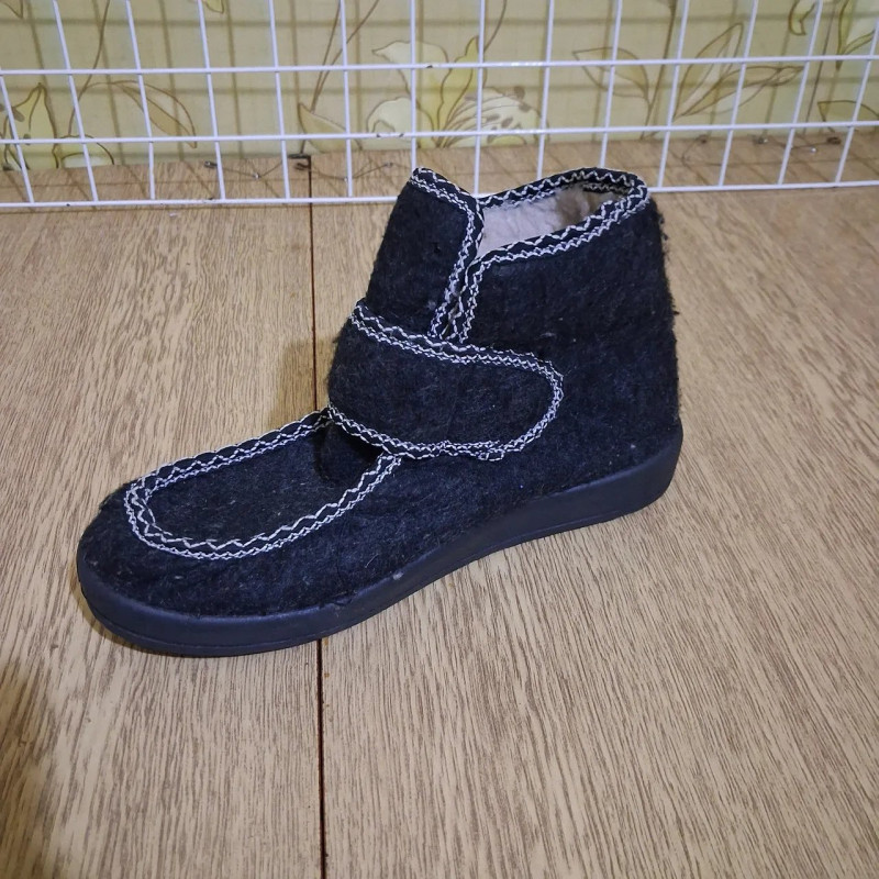 Самое теплое решение для зимы — женские войлочные ботинки (бурки/бабуши) в черном цвете. Эта модель идеально подходит для дома, двора и сухих морозных дней. Верх изготовлен из плотного нетканого материала (войлок/сукно), который отлично удерживает тепло и защищает от ветра. Декоративная белая строчка-зигзаг придает обуви аккуратный вид. Главная особенность этой модели — удобная застежка на широкой липучке. Это позволяет легко обувать и снимать ботинки даже пожилым людям или тем, у кого высокий подъем либо отечность ног. Внутри бурки утеплены густым светлым мехом, который согреет даже в сильные морозы. Литая подошва из ПВХ не промерзает, является гибкой и устойчивой к скольжению. Преимущества: Комфорт: Мягкие материалы не давят на косточки и суставы. Удобство: Застежка-липучка регулирует ширину голенища. Тепло: Эффект "валенка" — нога всегда в тепле и сухости. Характеристики: Тип: Бурки / Бабуши Материал верха: Войлок (текстиль) Утеплитель: Искусственный мех (густой) Подошва: ПВХ (прошитая) Цвет: Черный с белой строчкой Застежка: Липучка Размеры: 36-42 Сезон: Зима