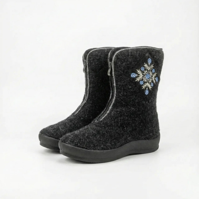 Очень теплые и уютные женские зимние сапожки (бурки), изготовленные из плотного войлока. Эта модель идеально подходит для сухих морозных дней. Главное преимущество — застежка-молния, расположенная спереди. Это максимально упрощает процесс обувания, что особенно важно для людей с высоким подъемом ноги или для пожилых людей. Сапожки украшены аккуратной вышивкой "Снежинка", что придает им привлекательный вид. Внутри обувь утеплена густым искусственным мехом (светлого цвета), который отлично аккумулирует тепло. Подошва высокая, изготовлена из вспененного ПВХ или полиуретана, что обеспечивает легкость походки и изоляцию от холодной земли. Это лучший подарок для мамы или бабушки, а также отличный вариант сменной обуви для работы в холодных помещениях. Характеристики: Материал верха: Войлок — дышащий и теплый материал. Утеплитель: Искусственный мех (набивная овчина). Застежка: Молния спереди (удобный вход). Дизайн: Вышивка "Голубая снежинка". Подошва: Литая, легкая, износостойкая. Цвет: Черный / Темно-серый. Сезон: Зима. Размерный ряд: 36-42.
