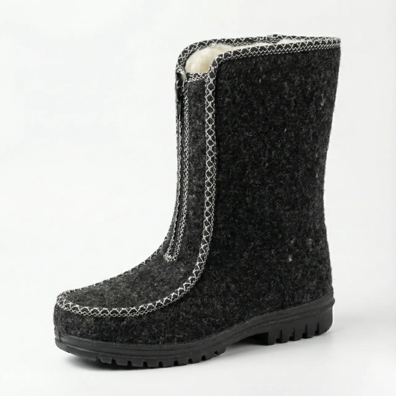 Натуральный войлок обладает уникальными теплоизоляционными свойствами — он сохраняет тепло при температуре до -30°C. Молния спереди позволяет обуваться за секунды, а материал пропускает воздух, предотвращая потливость. Декоративная строчка добавляет стильный акцент.