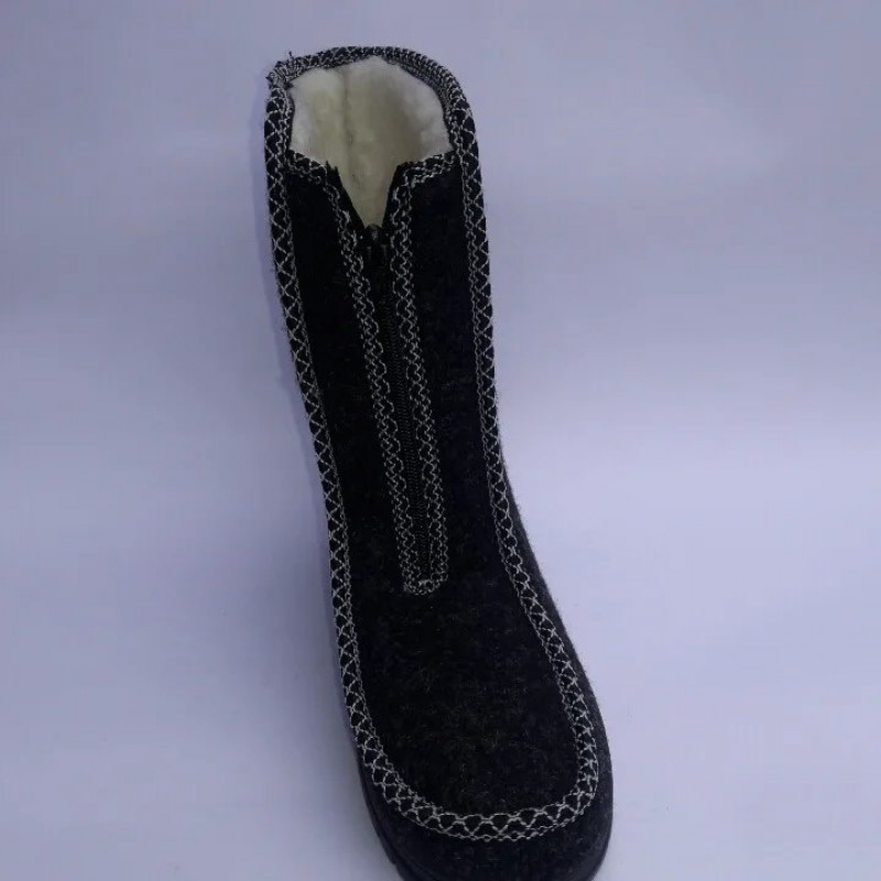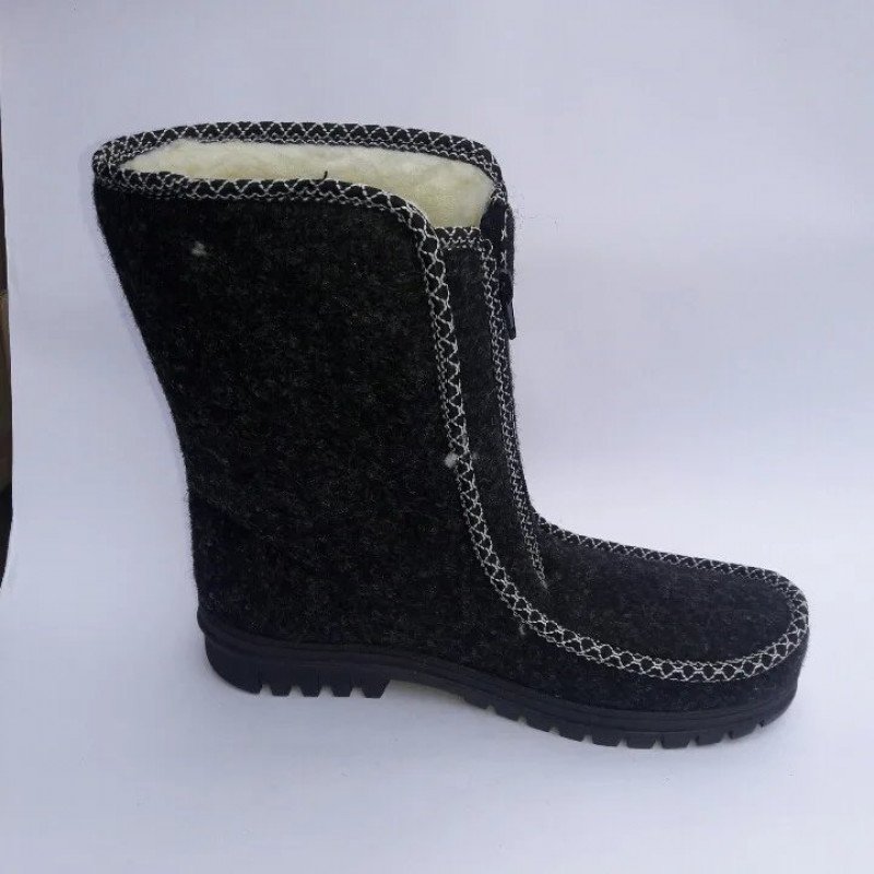 Черные войлочные бурки со строчкой и удобной молнией спереди — идеальное решение для украинской зимы. Натуральный войлок сохраняет тепло даже в сильные морозы, а практичная застежка позволяет быстро обуваться. Размеры 37-42 подойдут большинству женщин.