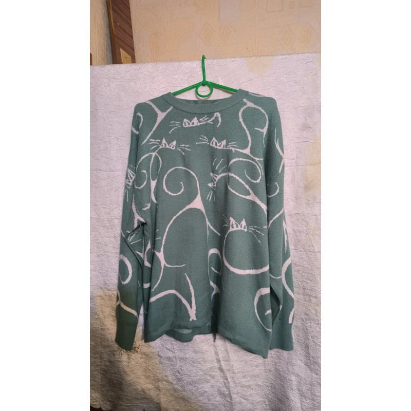 Женский вязаный свитер с котами, оверсайз джемпер цвет шалфей, теплая кофта с принтом кошек