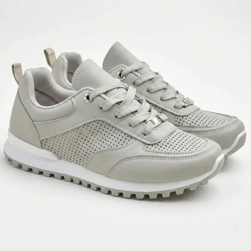 Ищете стильную и универсальную пару на каждый день? Эти женские кроссовки в светло-сером цвете — идеальная база для вашего гардероба. Дизайн вдохновлен классическими ретро-моделями, которые всегда в моде. Верх изготовлен из качественной мягкой эко-кожи, которая приятна на ощупь и легко чистится. Главное преимущество модели — активная перфорация (дырочки) на носке и по бокам. Это обеспечивает отличную вентиляцию, позволяя ногам "дышать" даже в теплую погоду. Белая подошва с рельефным протектором гарантирует устойчивость и комфорт при ходьбе. Кроссовки имеют аккуратную шнуровку в тон и стильный металлический декор на шнурках. Отлично сочетаются с джинсами, платьями и спортивной одеждой. Характеристики: Материал верха: Эко-кожа (с перфорацией) Материал подошвы: ПВХ/Резина (зубастый протектор) Цвет: Светло-серый (с теплым подтоном) Застежка: Шнуровка Сезон: Весна / Лето / Теплая осень Размерная сетка: 36-41