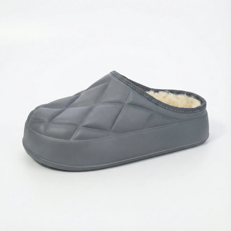 Стильные и невероятно теплые женские тапочки-"дутики" в универсальном сером цвете. Эта модель сочетает в себе комфорт домашней обуви и современный уличный стиль. Верх выполнен из водоотталкивающего материала (ЭВА/искусственная кожа) с эффектом стежки "ромбиком", что выглядит очень актуально в этом сезоне. Внутри тапочки утеплены густым и мягким эко-мехом (белого или светлого цвета), который отлично сохраняет тепло. Высокая утолщенная подошва-платформа не только добавляет роста, но и выполняет функцию термоизоляции — ваши ноги не замерзнут даже на самом холодном полу (плитка, бетон). Благодаря закрытому носку и материалу верха, за ними очень легко ухаживать — достаточно просто протереть влажной салфеткой. Преимущества: Трендовый дизайн: Эффектный "дутый" вид. Практичность: Не промокают, легко моются. Комфорт: Высокая подошва амортизирует шаги и защищает от холода снизу. Характеристики: Тип: Тапочки-дутики (Сабо утепленные) Материал верха: ЭВА / Искусственный материал (водоотталкивающий) Утеплитель: Искусственный мех Цвет: Серый Подошва: Платформа (ПВХ/ЭВА) Размеры: 37-41 Сезон: Зима / Осень