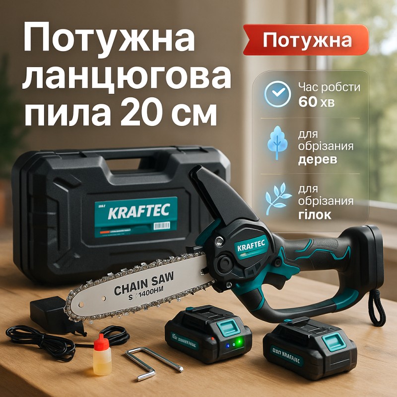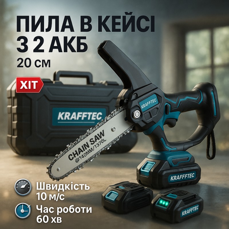 | Назва | Аккумуляторная цепная мини пила 20 см в кейсе Krafftec (36V 4 Ач) + 2 аккумулятор и индикатором заряда |