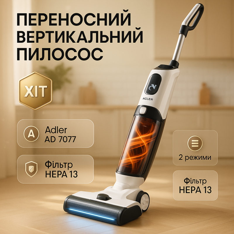 Adler AD 7077— це інноваційнийбездротовий пилосос 2-в-1, який поєднує в собі функцію пилососа та мийного пристрою. Завдяки потужномубезщітковому двигунуі розумній системі розподілу води, він одночасно пилососить і миє підлогу, скорочуючи час прибирання вдвічі.